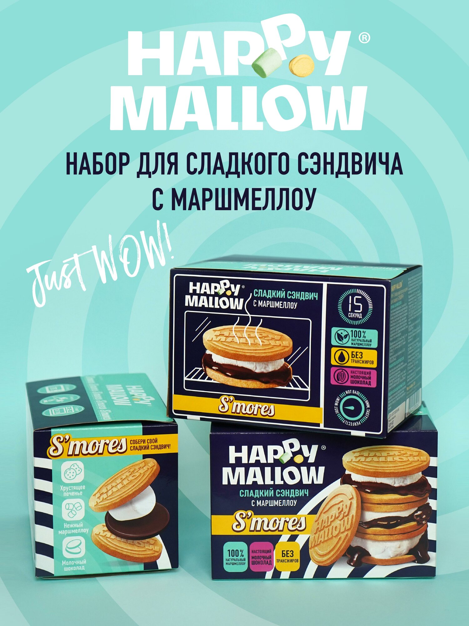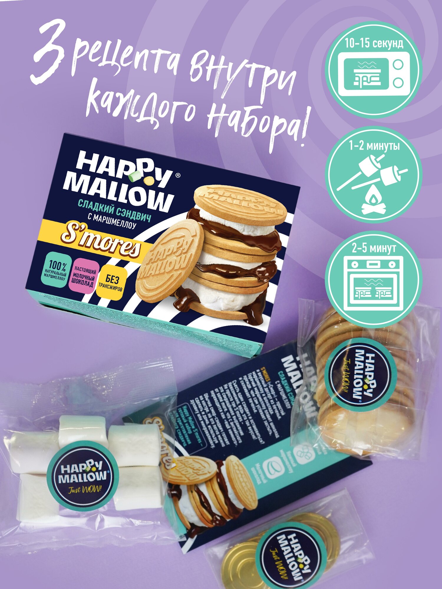 Сладкая сказка, набор для сладкого сэндвича Happy Mallow S’mores, 180 г. Happy Mallow S’mores – до гениальности простой и вкусный десерт из двух крекеров с прослойкой из маршмеллоу и шоколада. Его легко приготовить дома – нужно лишь соединить все продукты из коробочки вместе и разогреть. Горячая маршмеллка расплавит шоколад прежде, чем сама успеет застыть, и склеит две печеньки, придав лакомству вид сэндвича. Маршмеллоу — это 100% натуральный продукт. В его составе нет фруктового пюре и яичного белка, который входит в список основных аллергенов, а тонкий и лёгкий аромат придаёт натуральная ваниль. Продукт не содержит глютен - сложный белок, вызвающий чувство тяжести и дискомфорта при его чрезмерном употреблении и аллергию у людей с целиакией. Шоколад производится из настоящего молочного шоколада швейцарской компании Barry Callebaut («Барри Каллебаут»). Специально для печенья была разработана рецептура с уменьшенным количеством сахара, чтобы сэндвич не был слишком приторным и печенье идеально сочеталось с маршмеллоу и шоколадом.