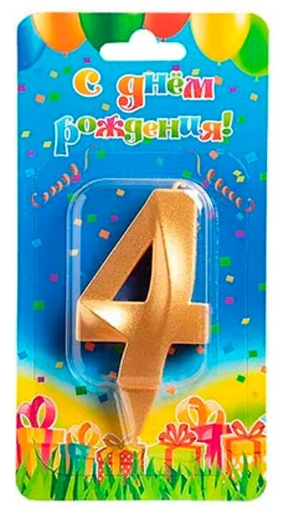 Парафиновая праздничная свеча для торта фигура цифра 4 высотой 7,5 см (вместе со шпажкой) золотистого цвета - стильное и яркое украшение для торта, которое сделает ваше торжество неповторимым. Свеча грань цифра четыре представляет собой золотую свечу в форме цифры, подходит для любого мальчика, девочки, девушки, друга, подруги, ваших дорогих и любимых. Свечки фигурки для торта детские и взрослые станут отличным дополнением на детский день рождения, юбилей и любой другой праздник и порадуют именинника. Свечи с держателями долго горят и надежно держатся на десерте. Набор свечей на торт - отличный декор для торта или кексов на день рождения, рождение ребенка, не оставят равнодушным ваших самых родных людей. Необычный стильный дизайн подойдет любому празднику, и свечка топпер подойдет для любого десерта и торжества. Материал: высококачественный парафин, который не трескается при горении.