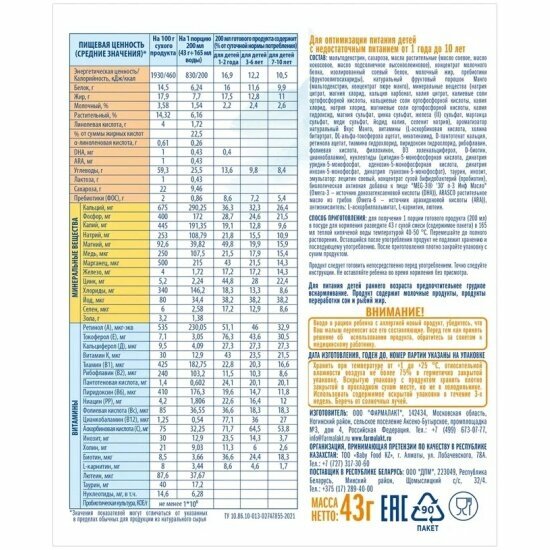 | Состав | пребиотики, пробиотики, соя, нуклеотиды, витаминный комплекс, фолиевая кислота, омега-3 и омега-6 жирные кислоты |