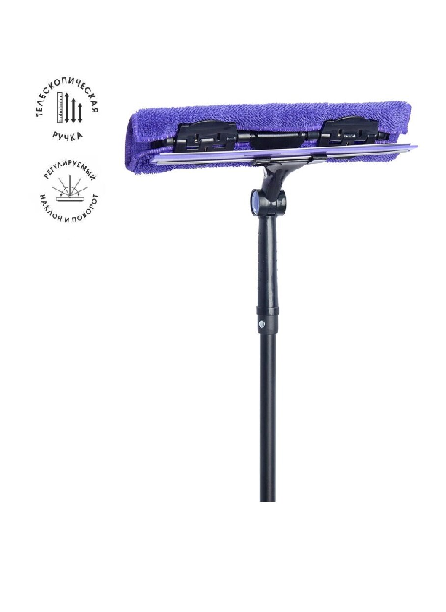 Стекломой "Сириус" с телескопической рукояткой и со съемной салфеткой (+ 1 съемная салфетка в комплекте). Легко и быстро очистит большие гладкие поверхности: стекла, зеркала, кафель и пр. Дополнительное удобство обеспечивает регулируемый наклон моющей части (5 режимов наклона).