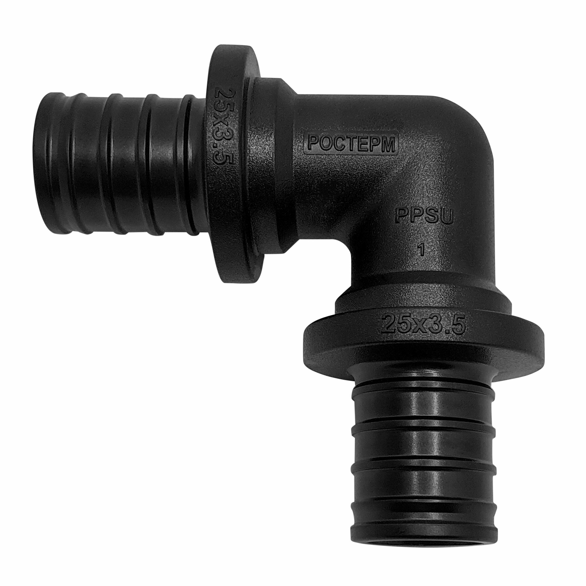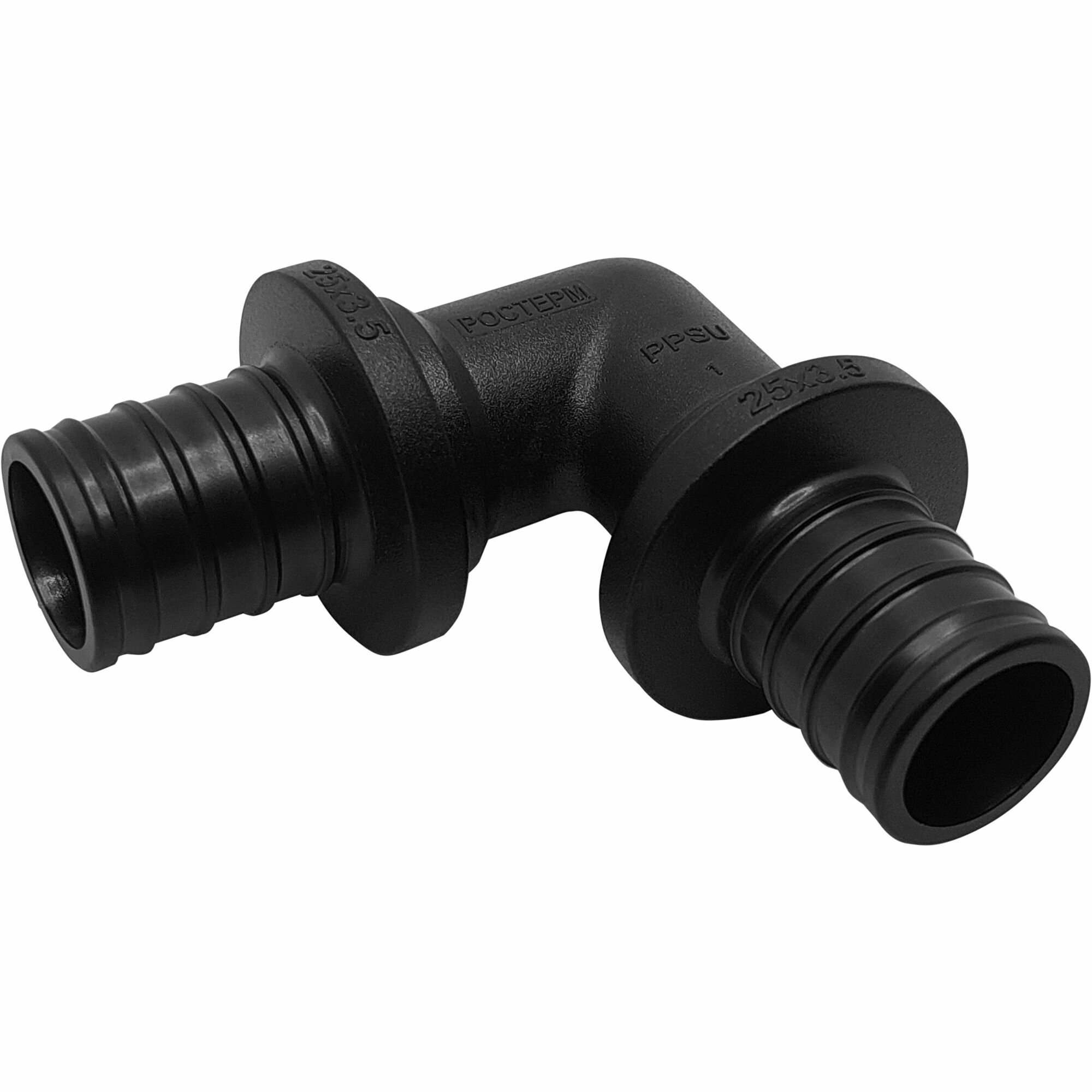 **Уголок РОСТерм 90° 25 PPSU равнопроходной**, устанавливается для создания угла поворота трубопровода на 90º путем соединения труб из сшитого полиэтилена диаметром 25 мм, совместно с напрессовочными гильзами PVDF соответствующего размера. Используется в аксиальной системе для соединения полимерных труб РЕ-Х и PE-RT. Для производства фитингов используется материал полифенилсульфон (PPSU). Данный материал сохраняет превосходные механические, электрические и тепловые характеристики при длительном воздействии высоких температур.