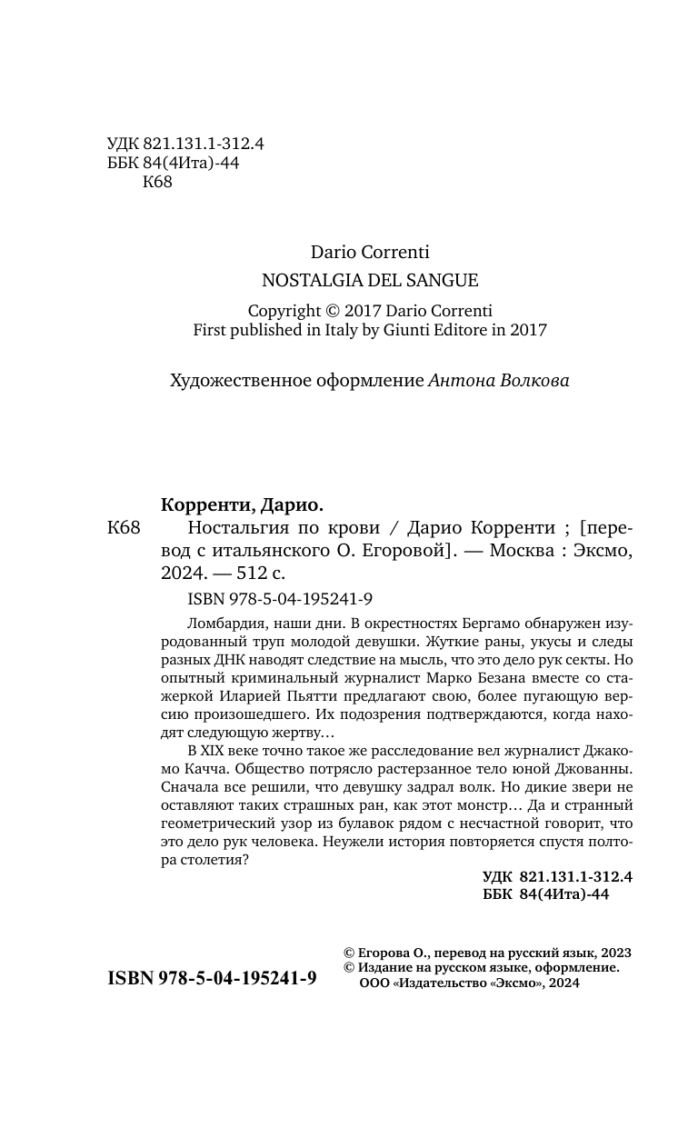 Книга: Ностальгия по крови (Дарио Корренти); Эксмо, Inspiria, Редакция 1, 2024