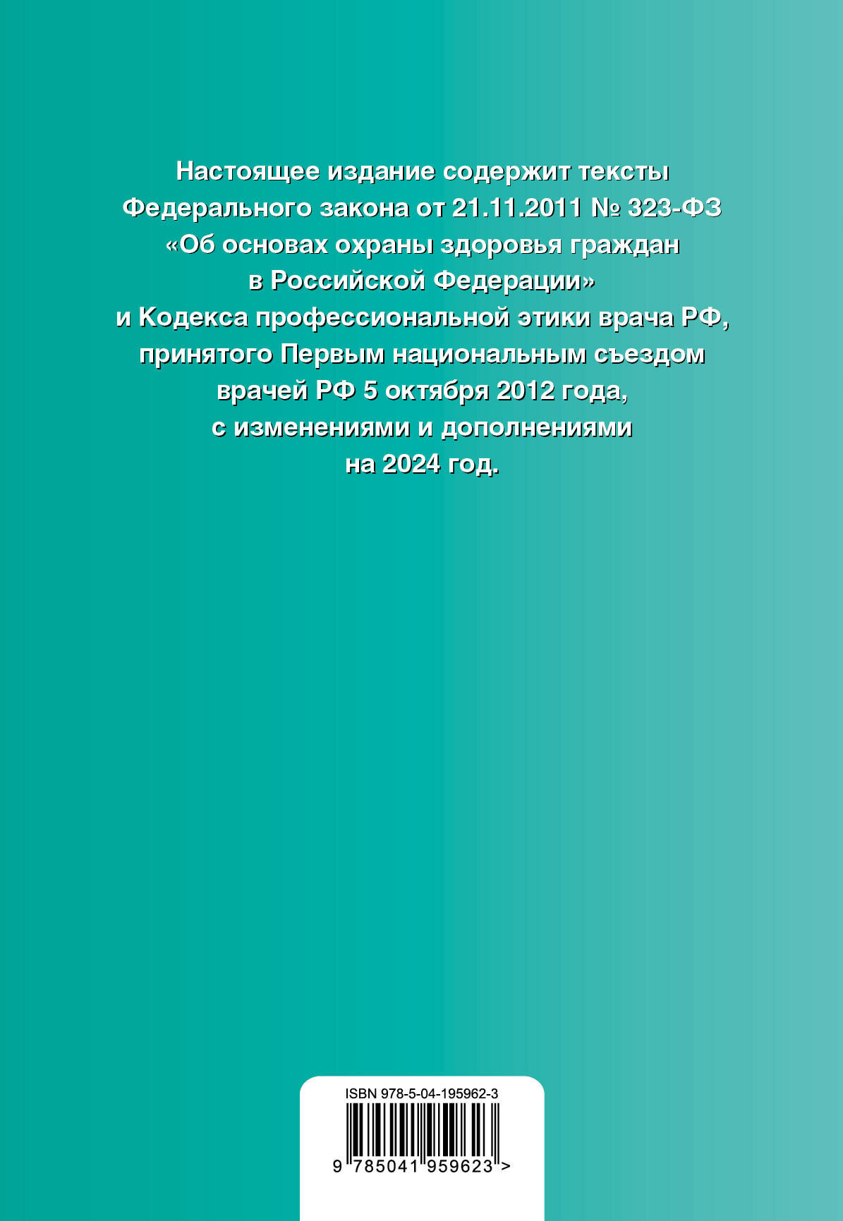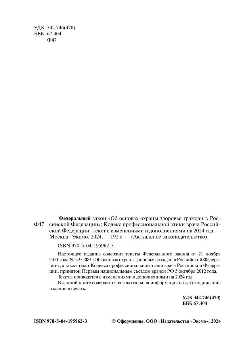 ФЗ "Об основах охраны здоровья граждан в Российской Федерации". Кодекс профессиональной этики врача РФ. В ред. на 2024 / ФЗ № 323-ФЗ (без автора); ООО "Издательство "Эксмо", 2024