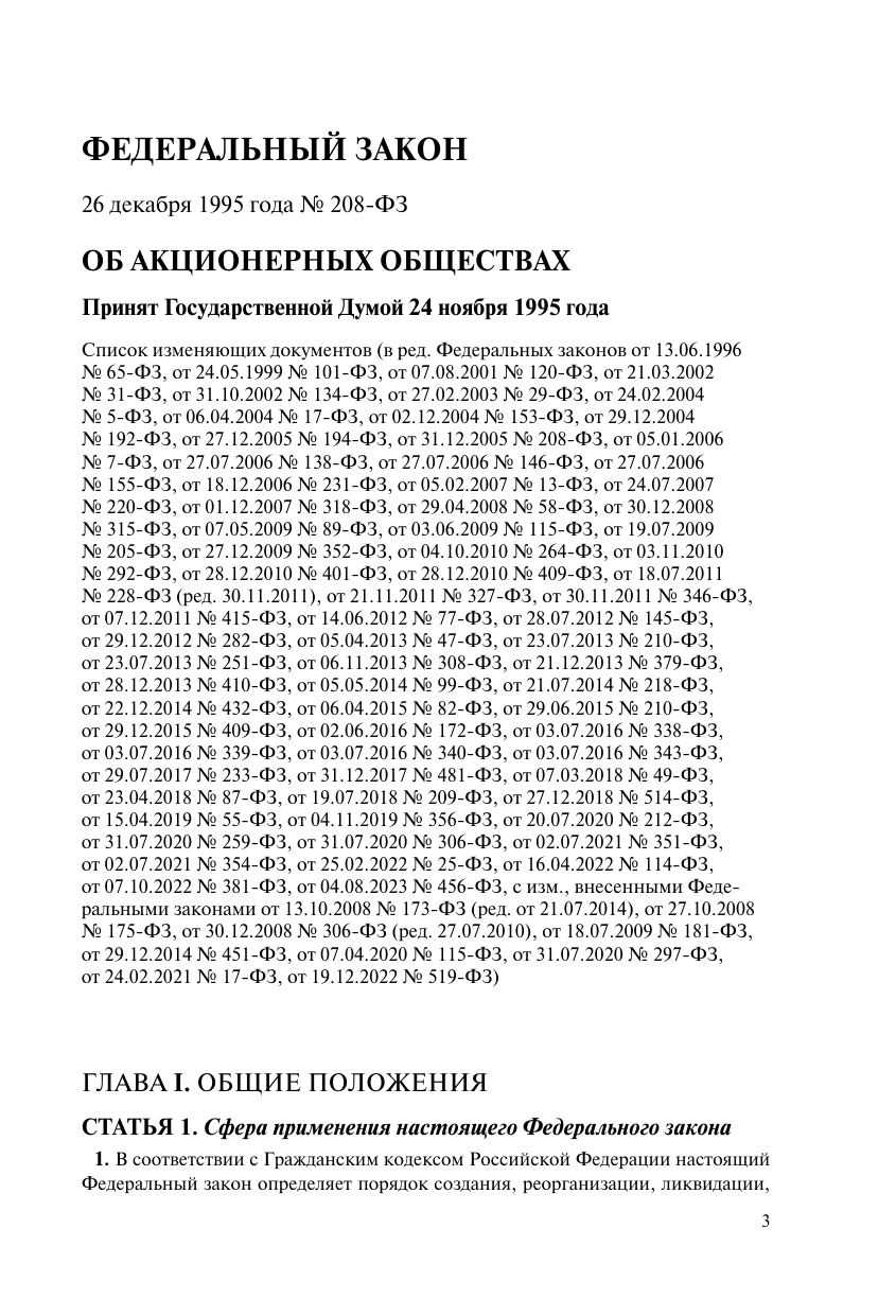 Настоящее издание содержит текст Федерального закона 26.12.1995 № 208-ФЗ «Об акционерных обществах» с изменениями и дополнениями на 2024 год. К изменениям, вступающим в силу позднее, вместе с редакцией нормы, действующей на эту дату, приводится норма в новой редакции и указывается дата, с которой она вступает в силу.