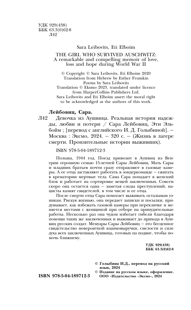 Девочка из Аушвица. Реальная история надежды любви и потери (Лейбовиц Сара, Элбоим Эти); ООО "Издательство "Эксмо", 2024