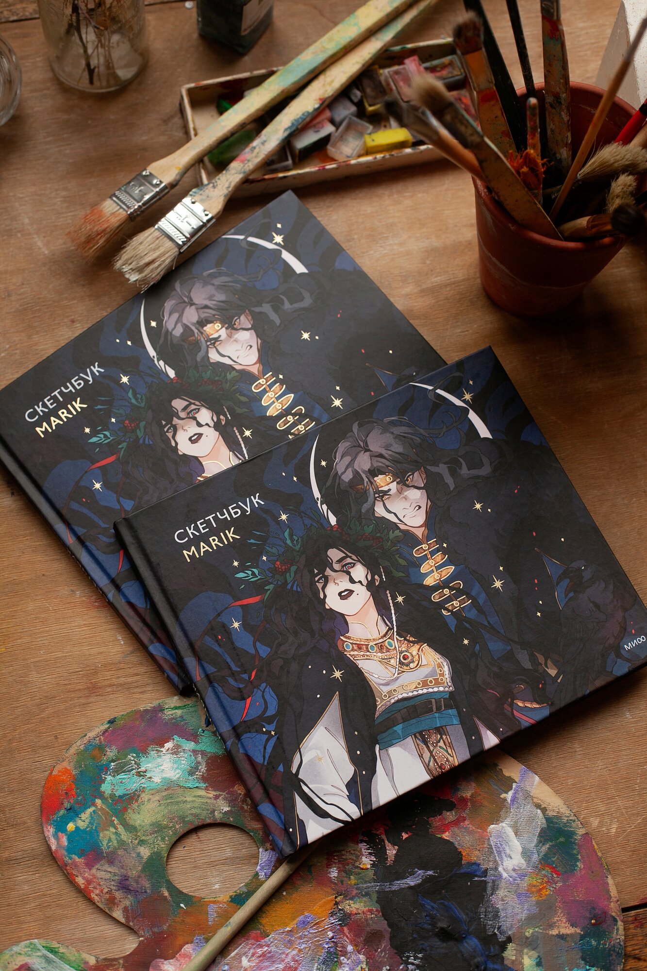 Скетчбук с плотными страницами и в твердой обложке с изображением от художницы Марик с прекрасной рисовкой. Обложка выглядит устрашающе, благодаря удачно падающим теням и темному фону. Персонажи как будто вылезли из страшной русской народной сказки, на что намекает их одежда и символика. Поэтому всем любителям фольклора я бы посоветовала этот скетчбук.