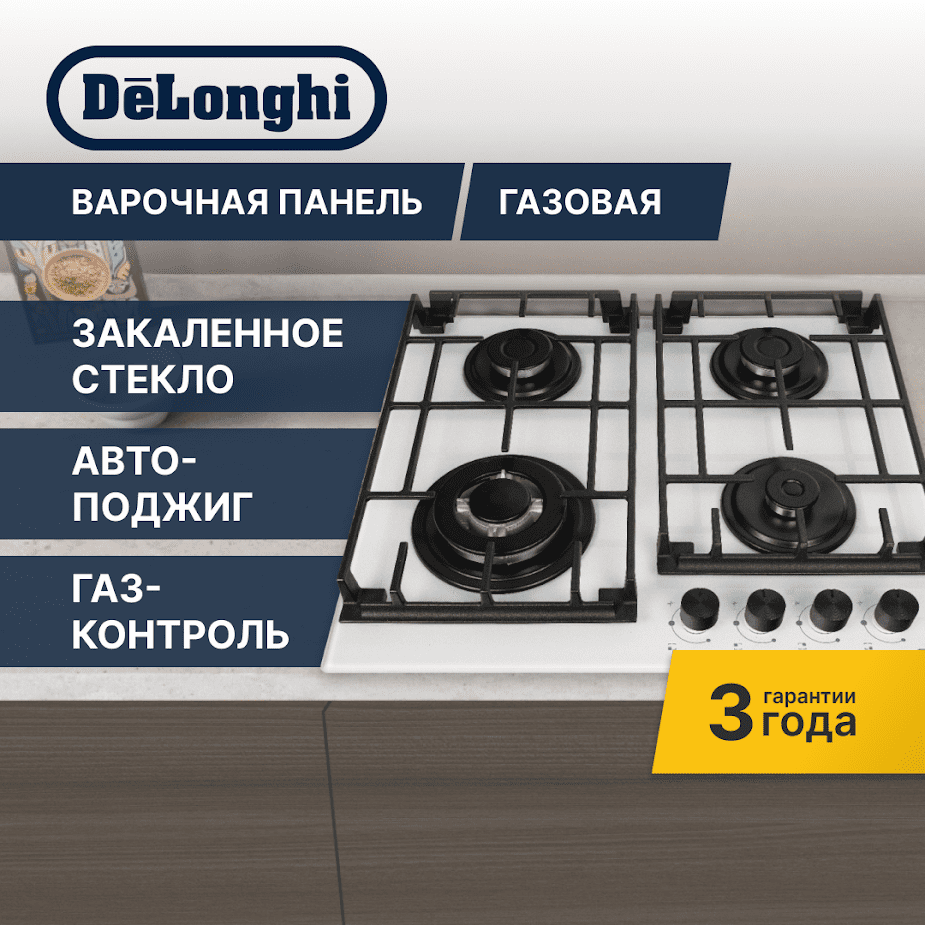 Газовая варочная панель DeLonghi – это надежность, безопасность и высокое качество от итальянского бренда.o Варочная панель с четырьмя конфорками:· 1 WOK-конфорка с тройным рядом пламени 3500 Вт;· 2 стандартные конфорки 1700 Вт;· 1 экономичная конфорка 900 Вт.o Стандартная ширина панели – 58 см.o Прочные чугунные решетки - не деформируются со временем, отличаются устойчивостью и долговечностью.o Автоматический розжиг - включайте конфорку одним поворотом переключателя без использования дополнительных приспособлений.o Фронтальная панель управления - удобство при эксплуатации и уходе.o Функция газ-контроль - защита, исключающая утечку газа, в случае затухания конфорки.o Белый цвет, стекло - стильный выбор для вашего интерьера.