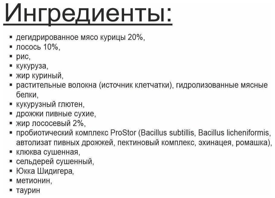 Лососевый и куриный жиры в составе богаты жирными аминокислотами, придающими здоровый блеск шерсти питомца. Сельдерей, содержит богатый комплекс витаминов (C, A, B, E), минералов и волокон, необходимых для здоровья питомца.