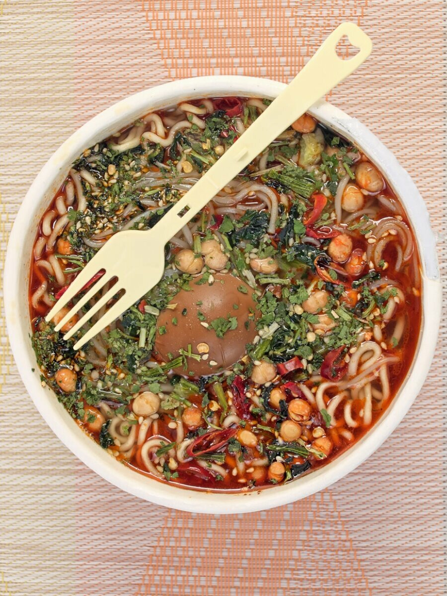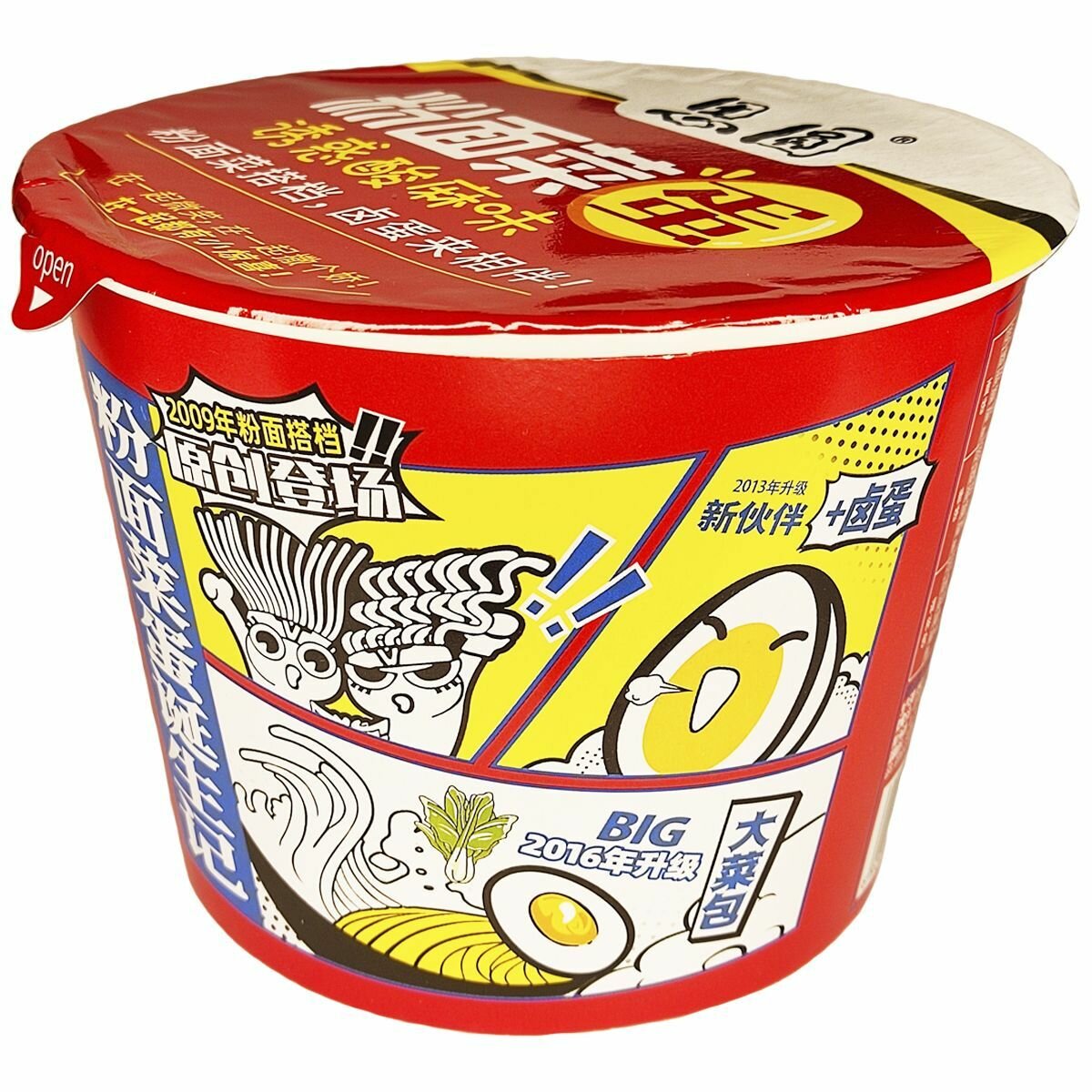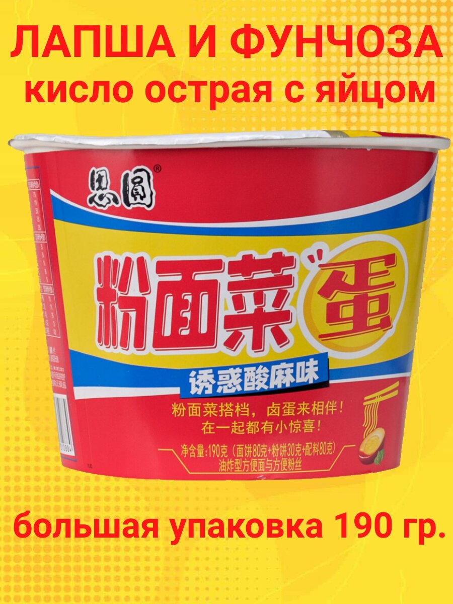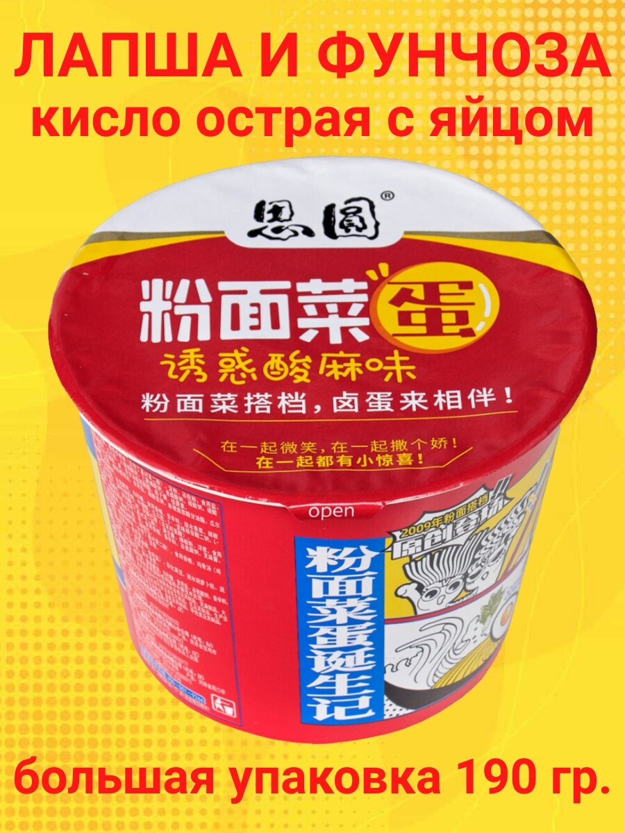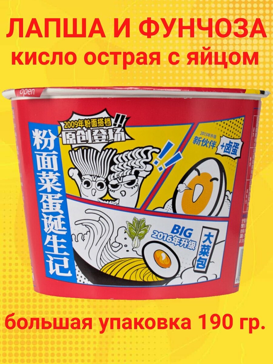 Лапша быстрого приготовления прямо из Китая. Продукт состоит из двух видов лапши: пшеничной и фунчезы. Яйцо замариновано по классическому китайскому рецепту. Пикантность лапше придает большой набор соусов и приправ.