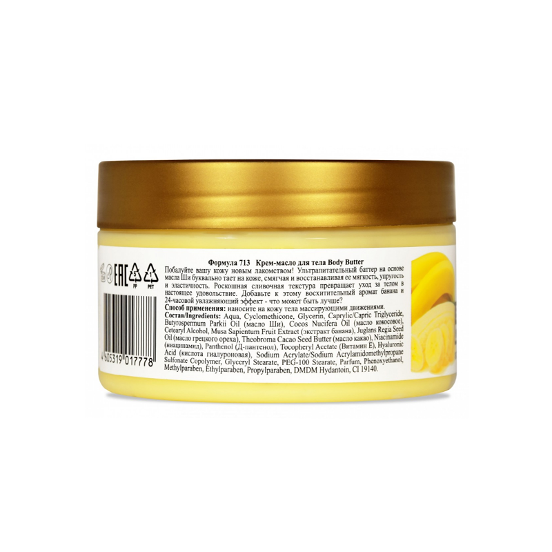 Побалуйте вашу кожу новым лакомством! Ультра-питательный баттер на основе масла Ши буквально тает на коже, смягчая и восстанавливая ее мягкость, упругость и эластичность. Роскошная сливочная текстура превращает уход за телом в настоящее удовольствие. Добавьте к этому восхитительный аромат банана и 24-часовой увлажняющий эффект - что может быть лучше? Подходит для веганов.