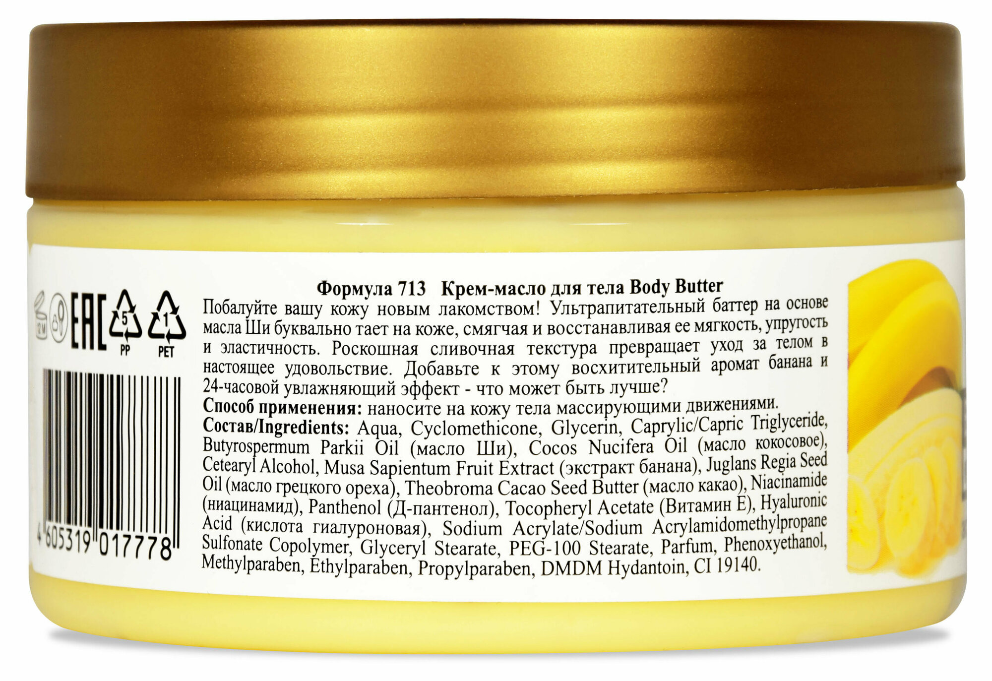 | Состав | Aqua, Cyclomethicone, Glycerin, Caprylic/Capric Triglyceride, Butyrospermum Parkii Oil (масло Ши), Cocos Nucifera Oil (масло кокосовое), Cetearyl Alcohol, Musa Sapientum Fruit Extract (экстракт банана), Juglans Regia Seed Oil (масло грецкого ореха), Theobroma Cacao Seed Butter (масло какао), Niacinamide (ниацинамид), Panthenol (Д-пантенол), Tocopheryl Acetate (Витамин Е), Hyaluronic Acid (кислота гиалуроновая), Sodium Acrylate/Sodium Acrylamidomethylpropane Sulfonate Copolymer, Glyceryl Stearate, PEG-100 Stearate, Parfum, Phenoxyethanol, Methylparaben, Ethylparaben, Propylparaben, DMDM Hydantoin, CI 19140 |