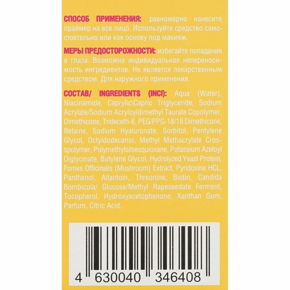 | Способ применения | Равномерно нанесите праймер на все лицо. Используйте средство самостоятельно или как основу под макияж. Избегайте попадания в глаза. Возможна индивидуальная непереносимость ингредиентов. Не является лекарственным средством. |