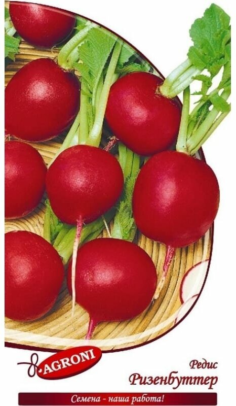 Семена Агрони Редис ризенбуттер 1710 - среднеранний сорт (25-30 дней), для выращивания под пленочными укрытиями и в открытом грунте. Урожайность 1.6-2.5 кг/кв. м. Корнеплод красный, округлый, диаметром 4-6 см, массой 30-40 г. Мякоть белая, сочная, нежная. Ценность сорта: раннеспелость.