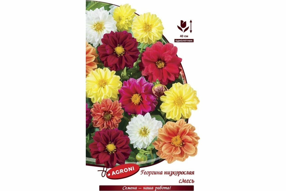 Семена Агрони Георгина низкорослая смесь 7897 высевают в марте в рассадные ящики. Растения высотой около 40 см. Цветы крупные, самых разнообразных оттенков. Цветет с июля по октябрь. Необходим обильный полив и подкормки.