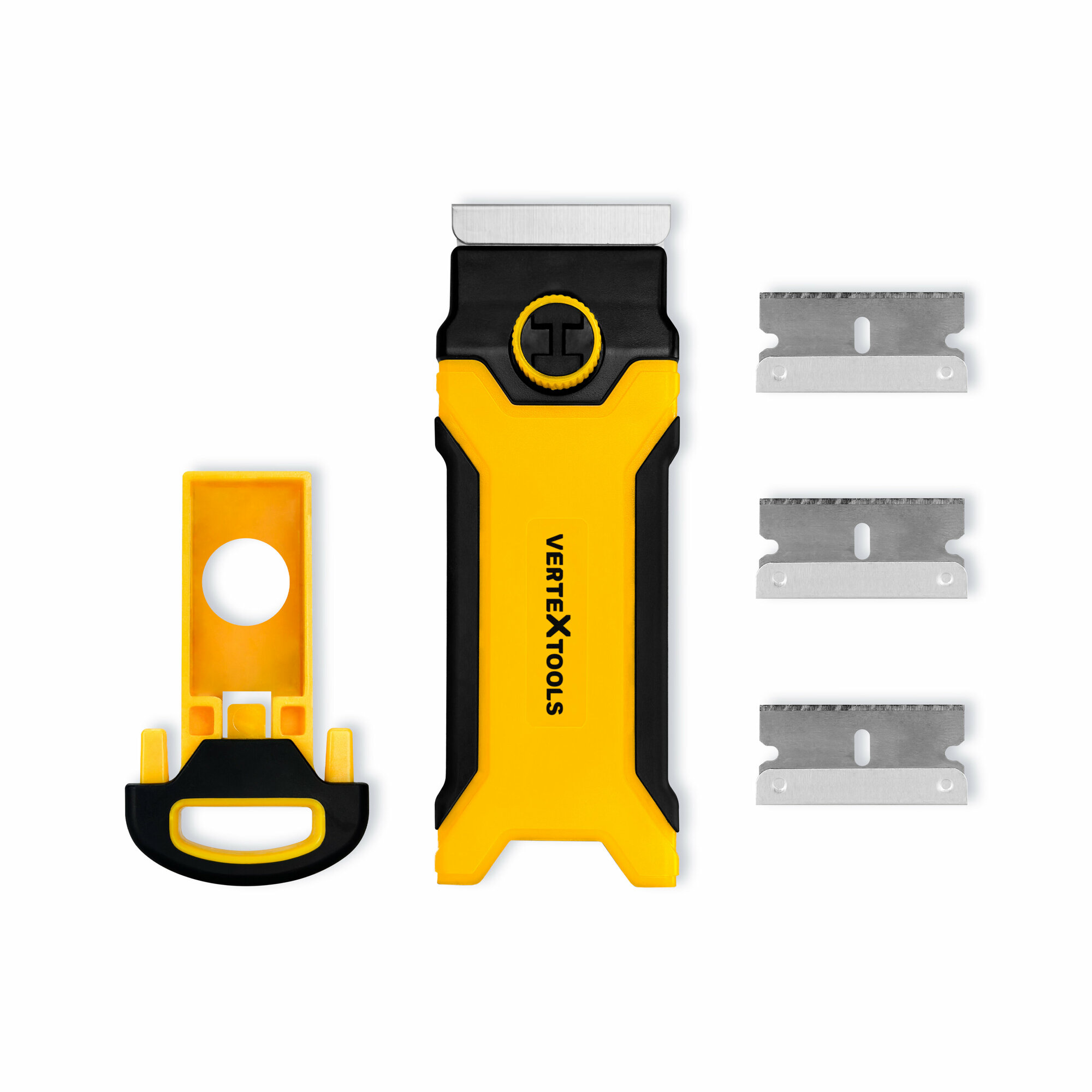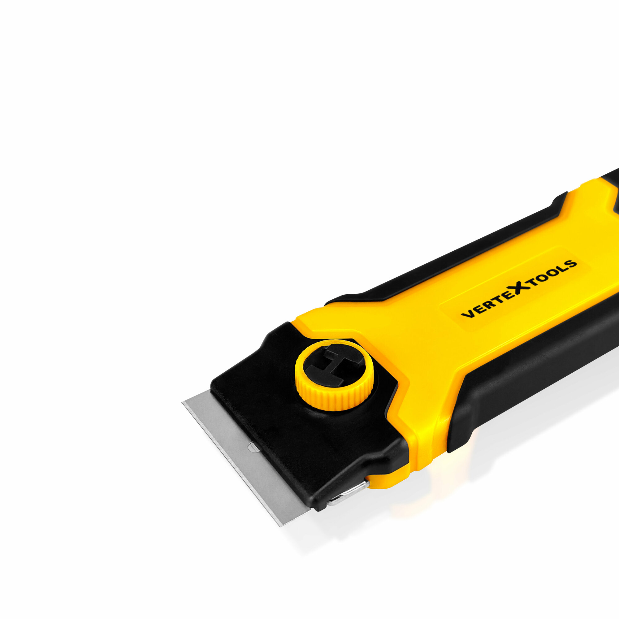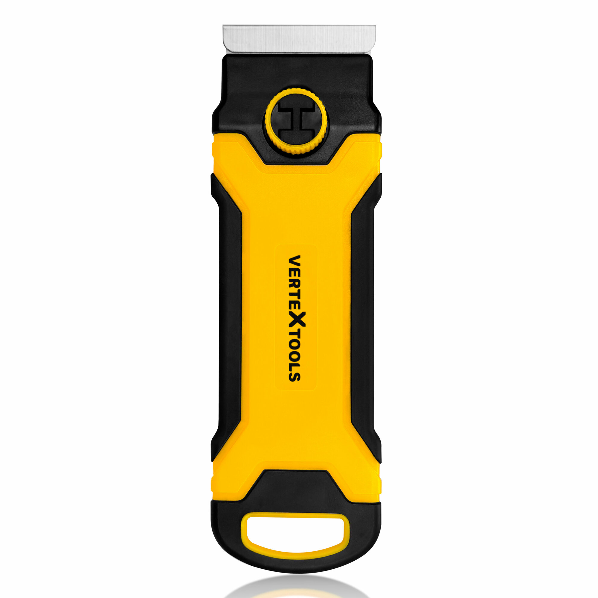Скребок универсальный VertexTools PROFI CLEAN предназначен для бережного и эффективного удаления свежих или застарелых загрязнений таких как жир, смола, жевательная резинка, битум или краска со стеклокерамических, кафельных, ламинированных и других гладких поверхностей.Надежная конструкция гарантирует длительный срок службы.Скребок выполнен из прочного ABS пластика с TPR покрытием корпуса, препятствуют скольжению в руках и обеспечивают удобство в работе.Механизм легкой замены лезвия обеспечит быструю, безопасную смену.В комплекте всего 5 лезвий из нержавеющей стали, 1 расположено в держателе, 4 в специальном отделении корпуса.Ширина лезвия 39 мм.