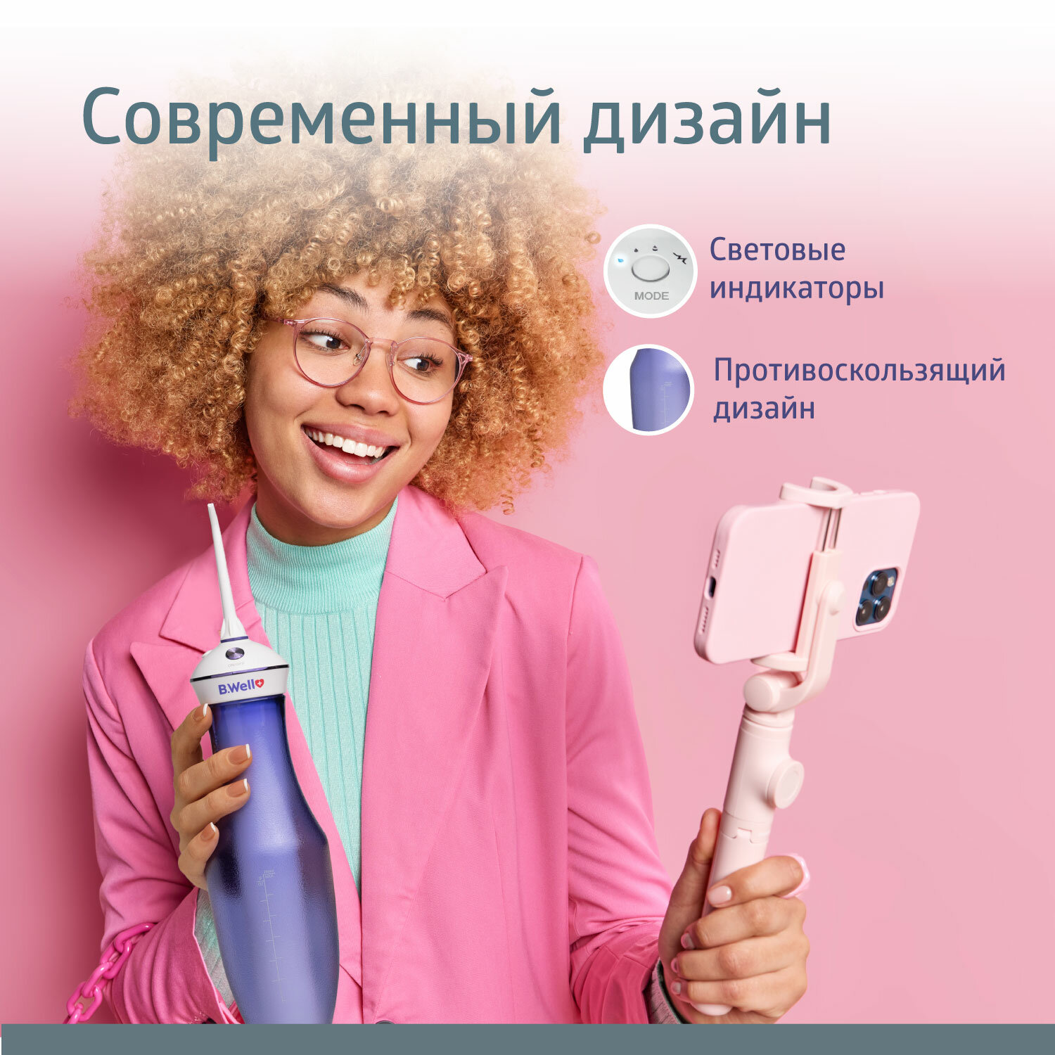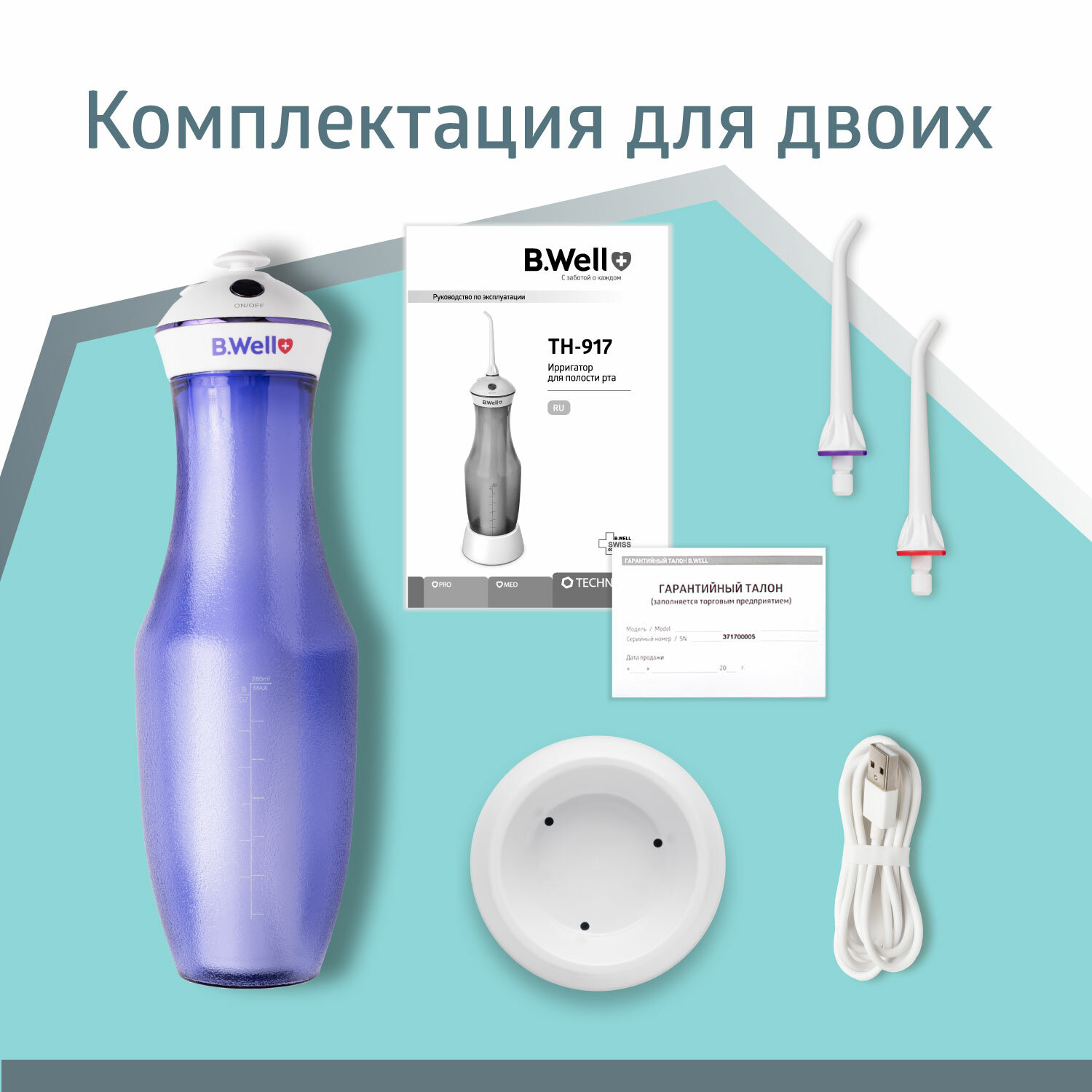 Ирригатор для полости рта B.Well разработан швейцарскими экспертами в области ухода за полостью рта. Он позволяет в домашних условиях удалить зубной налет, очистить ортодонтические конструкции (например, брекет-систему или ретейнер), предотвратить развитие заболеваний зубов и десен.Мощность и частота пульсации ирригатора для полости рта портативного B.Well не уступают стационарному прибору, поэтому он гарантирует качественную гигиену полости рта и выполнение поставленной задачи на 100%.Ирригатор отличается стильным дизайном, что делает его отличным аксессуаром для ванной комнаты и удачным подарком. Емкость прибора легко снимается, а световые индикаторы помогают легче ориентироваться в его работе. Эргономичность и противоскользящее покрытие ирригатора для чистки зубов обеспечивает надежную фиксацию в руке. Ирригатор портативный B.Well работает от аккумулятора. Одной полной зарядки прибора хватает на 46 минут или до месяца работы, поэтому его не нужно часто заряжать даже при активном использовании. У ирригатора B.Well 4 режима работы: *Стандартный — для эффективной чистки;*Мягкий — для чувствительных зубов и десен;*Персональный — для индивидуальной настройки мощности;*Режим массажа — для оздоравливания десен и улучшения кровооброщения. Прибор подойдет как для профессионалов, так и для тех, кто пользуется ирригатором в первый раз.Ирригатор портативный B.Well подходит как для индивидуального, так и для парного использования. 2 насадки с разными колечкам помогут не запутаться и сделают чистку комфортной сразу для двух разных пользователей. Ирригатор B.Well подходит для взрослых и детей старше 8 лет.