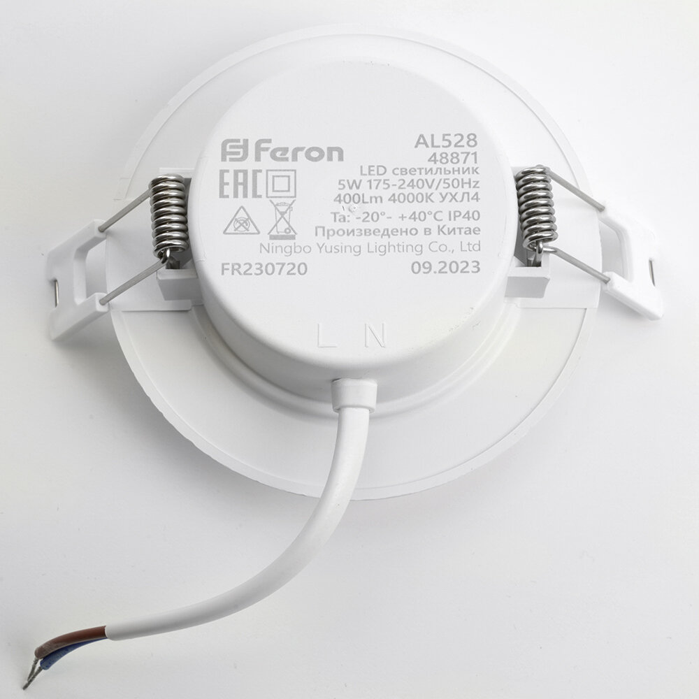 RAL9003. Светильник встраиваемый светодиодный, декоративный (ДВО) FERON AL528, 5W 4000К (белый), 175-240V, 400Lm, IP40, угол рассеивания 120°, цвет белый, корпус пластик, рассеиватель пластик, 90,5*90,5*28 мм, монтажн.отв. 80*80 мм.