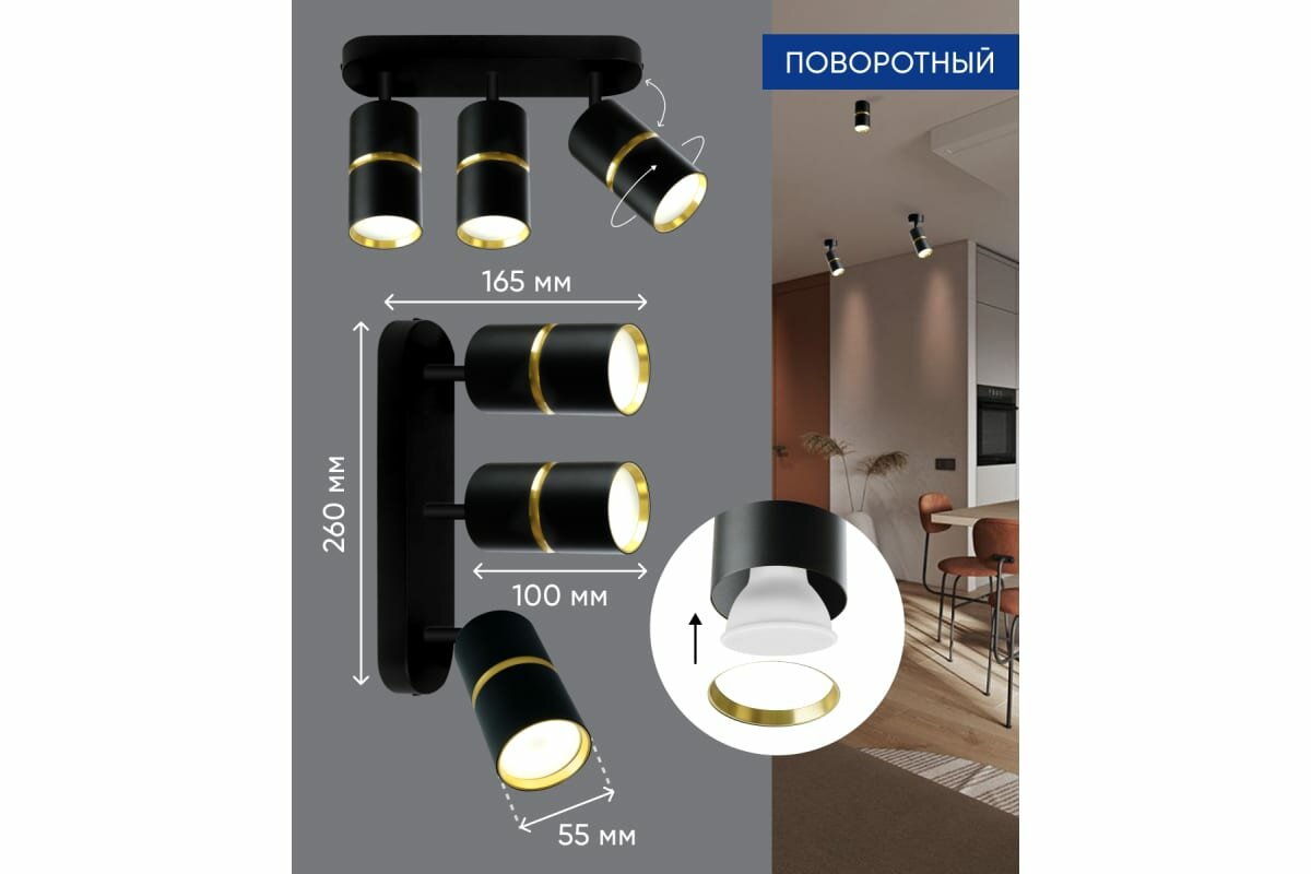 Светильник накладной под лампу, спот (-) FERON ML1863 , GU10 3*35W, 230V, IP20, цвет черный-золото , корпус алюминий, 380*380*165За счет универсального дизайна и лаконичной формы, светильник будет гармонично смотреться в вашем доме и поможет расставить световые акценты.