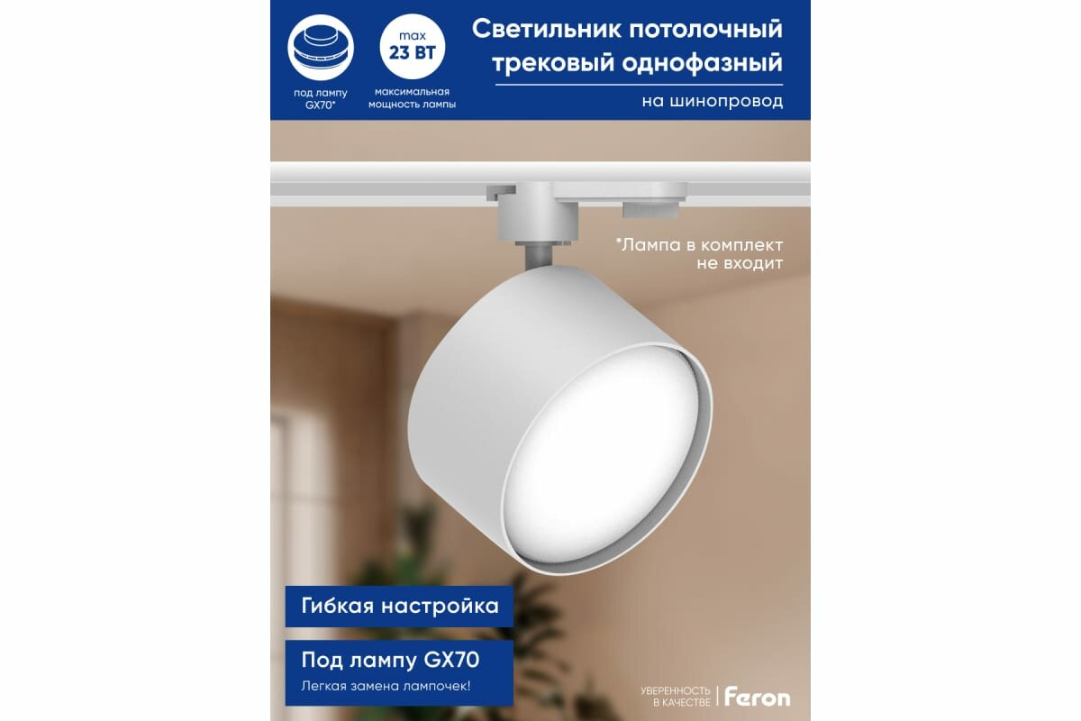 Светильники трековые на шинопровод GX70, однофазный (ИВО) FERON AL166 артикул 48544, 23 W, 230V, цвет черный, корпус алюминий, вращение >350°/v90°, 115*115*66 мм Трековые системы освещения - один из популярных способов подсветки интерьера жилых помещений. Это лучший вариант для создания акцентного освещения, они подчеркнут детали интерьера или превратят дом в настоящую арт-галерею. Трековые светильники можно использовать как для акцентной подсветки, так и для основного освещения. Шинопровод для светильников является главным элементом трековых систем. Потолочная шина в ассортименте Feron представлена длиной 1 метр (100см) или 2 метра (200см). Часто она представляет собой короб, профиль из металла на основе алюминия или пластика. Внутри располагается от 2 до 4 токопроводящих жил. Их разделяют на однофазные и трехфазные треки. В первом варианте используется 2 фазы, во втором – 4. Выбор определенного варианта зависит от сложности требуемой задачи. Направляющая для светильника позволяет уместить несколько различных моделей магнитных трековых светильников – споты (светильник точечный трековый), длинные светильники (трековый светильник линейный), светильники под лампу с цоколем и светодиодные led, а также светильник трековый подвесной. Количество светильников, мощность и тип, выбирается исходя из конкретных требований к освещению помещения. Большой выбор соединительных коннекторов, специальных фиксаторов, делает возможным потолочный и настенный способ фиксации шинопровода. Трековые светильники производятся с оригинальным дизайном, благодаря чему их не составит труда интегрировать в любой интерьер. Главным отличием трехфазного шинопровода от однофазного является возможность его использования с напряжением 220 вольт. Светильники можно группировать и использовать раздельное управление. Такая особенность позволяет снизить общую нагрузку на электросеть и создать уникальное и оптимальное использование пространства.