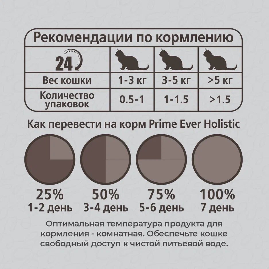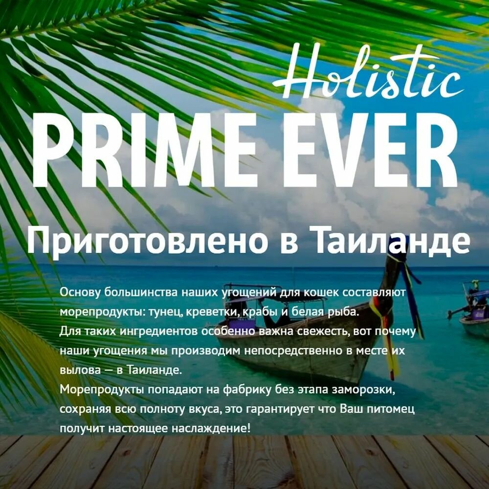 Дополнительное влажное питание класса холистик для кошек всех возрастов.Основу большинства наших угощений для кошек составляют морепродукты: тунец, лосось, макрель.Для таких ингредиентов особенно важна свежесть, вот почему наши угощения мы производим непосредственно в месте их вылова — в Таиланде. Морепродукты и мясо попадают на фабрику без этапа заморозки, сохраняя всю полноту вкуса, это гарантирует что ваш питомец получит настоящее наслаждение!Корм изготовлен в соответствии со стандартами FEDIAF (Европейская федерация производителей кормов для? животных) из ингредиентов, пригодных в питании человека (human grade).PRIME EVER не содержит: злаков, соевого белка, ГМО, искусственных консервантов, красителей и ароматизаторов.РЕКОМЕНДАЦИИ ПО КОРМЛЕНИЮ:Кошка весом 1-3 кг – 0,5-1 пакетик в сутки.Кошка весом 3-5 кг – 1-1,5 пакетика в сутки.Кошка весом более 5 кг – более 1,5 пакетиков в сутки.