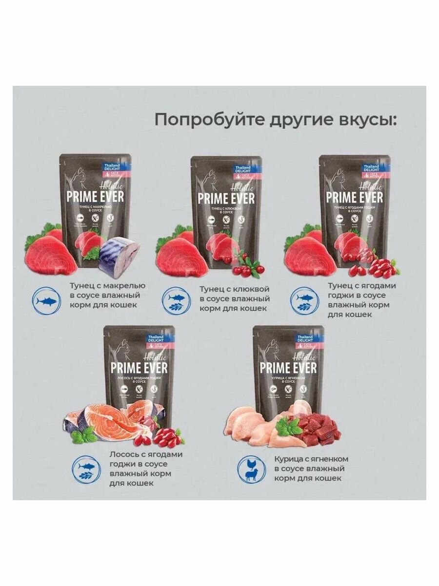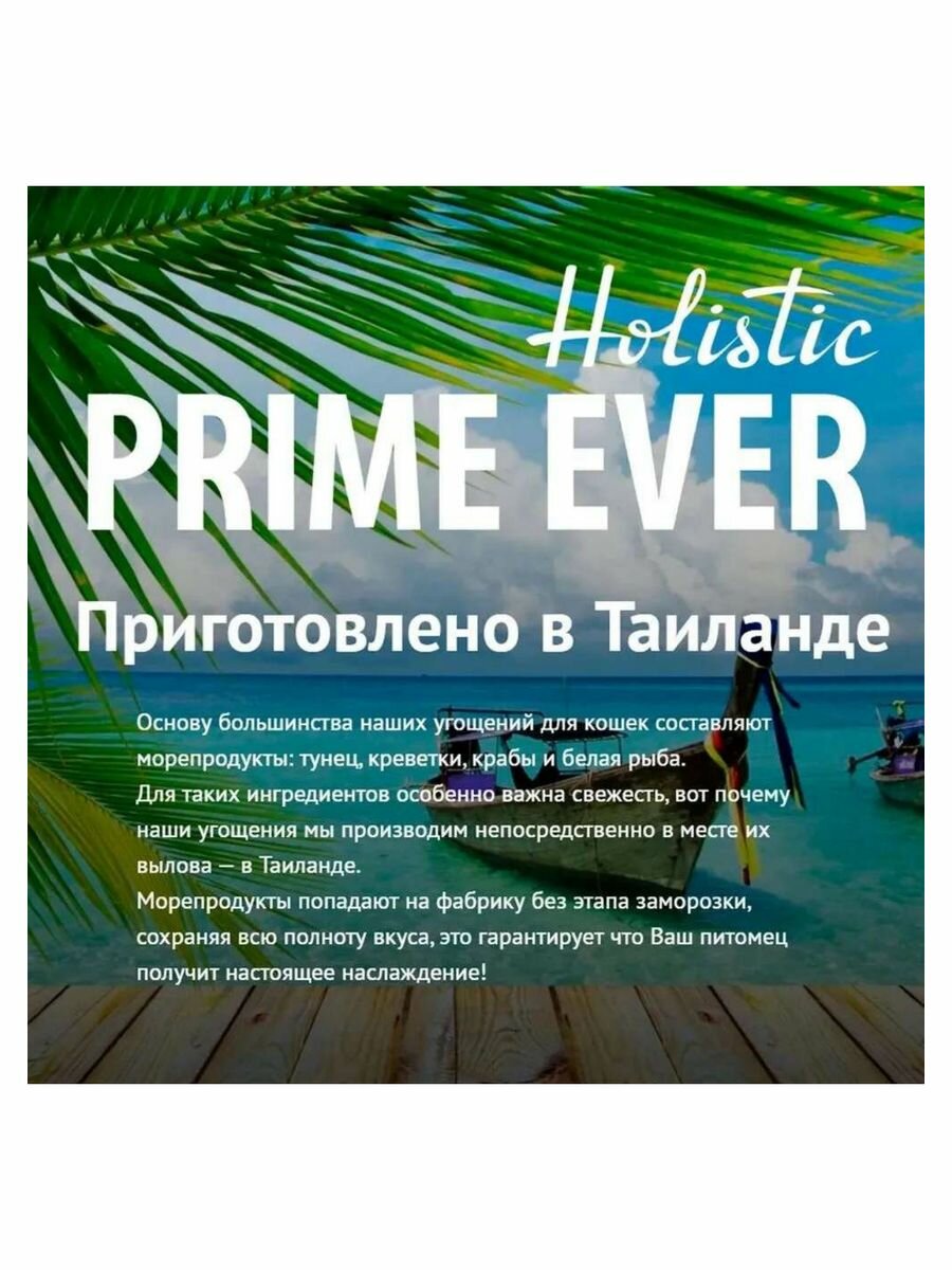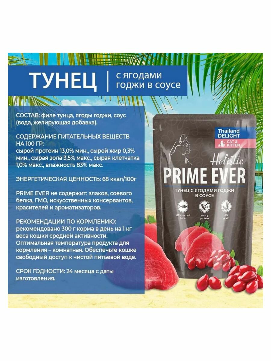 Дополнительное влажное питание класса холистик для кошек всех возрастов.Основу большинства наших угощений для кошек составляют морепродукты: тунец, лосось, макрель.Для таких ингредиентов особенно важна свежесть, вот почему наши угощения мы производим непосредственно в месте их вылова — в Таиланде. Морепродукты и мясо попадают на фабрику без этапа заморозки, сохраняя всю полноту вкуса, это гарантирует что ваш питомец получит настоящее наслаждение!Корм изготовлен в соответствии со стандартами FEDIAF (Европейская федерация производителей кормов для? животных) из ингредиентов, пригодных в питании человека (human grade).PRIME EVER не содержит: злаков, соевого белка, ГМО, искусственных консервантов, красителей и ароматизаторов.РЕКОМЕНДАЦИИ ПО КОРМЛЕНИЮ:Кошка весом 1-3 кг – 0,5-1 пакетик в сутки.Кошка весом 3-5 кг – 1-1,5 пакетика в сутки.Кошка весом более 5 кг – более 1,5 пакетиков в сутки.