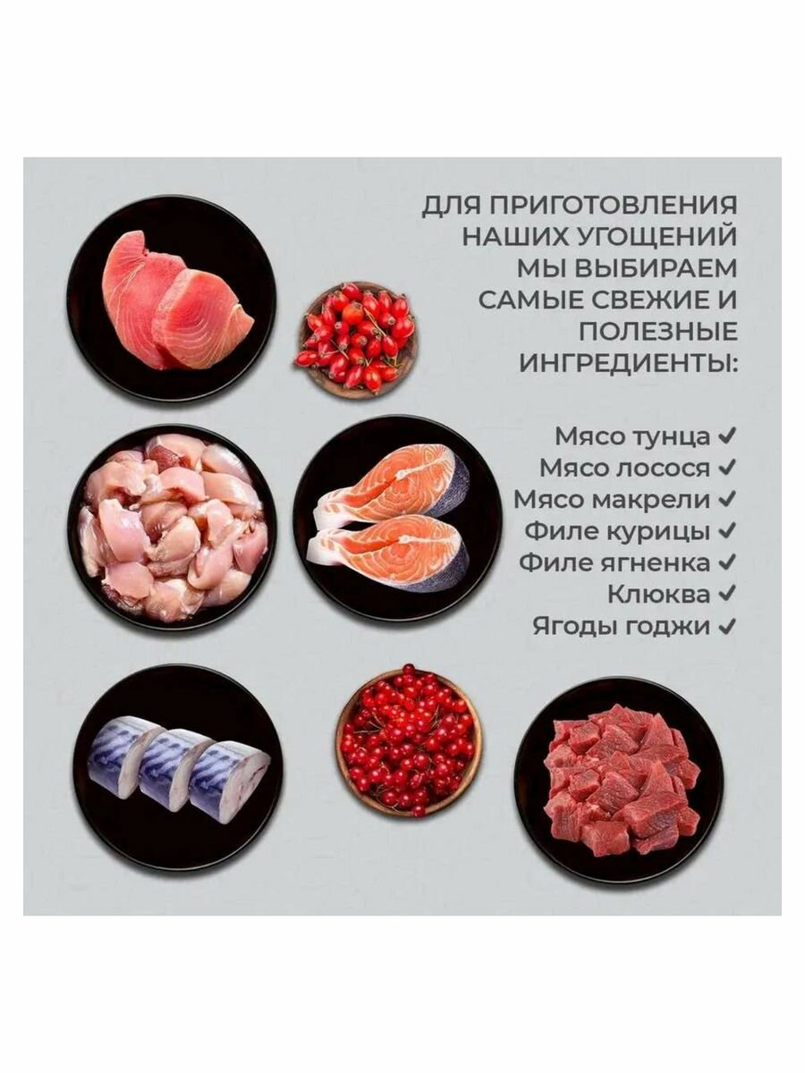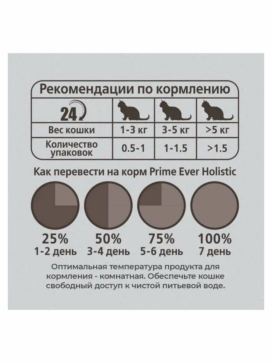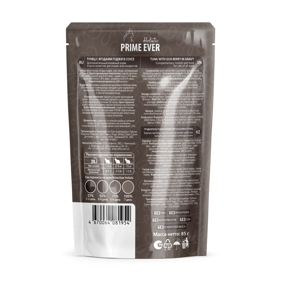 Дополнительное влажное питание класса холистик для кошек всех возрастов.Основу большинства наших угощений для кошек составляют морепродукты: тунец, лосось, макрель.Для таких ингредиентов особенно важна свежесть, вот почему наши угощения мы производим непосредственно в месте их вылова — в Таиланде. Морепродукты и мясо попадают на фабрику без этапа заморозки, сохраняя всю полноту вкуса, это гарантирует что ваш питомец получит настоящее наслаждение!Корм изготовлен в соответствии со стандартами FEDIAF (Европейская федерация производителей кормов для? животных) из ингредиентов, пригодных в питании человека (human grade).PRIME EVER не содержит: злаков, соевого белка, ГМО, искусственных консервантов, красителей и ароматизаторов.РЕКОМЕНДАЦИИ ПО КОРМЛЕНИЮ:Кошка весом 1-3 кг – 0,5-1 пакетик в сутки.Кошка весом 3-5 кг – 1-1,5 пакетика в сутки.Кошка весом более 5 кг – более 1,5 пакетиков в сутки.