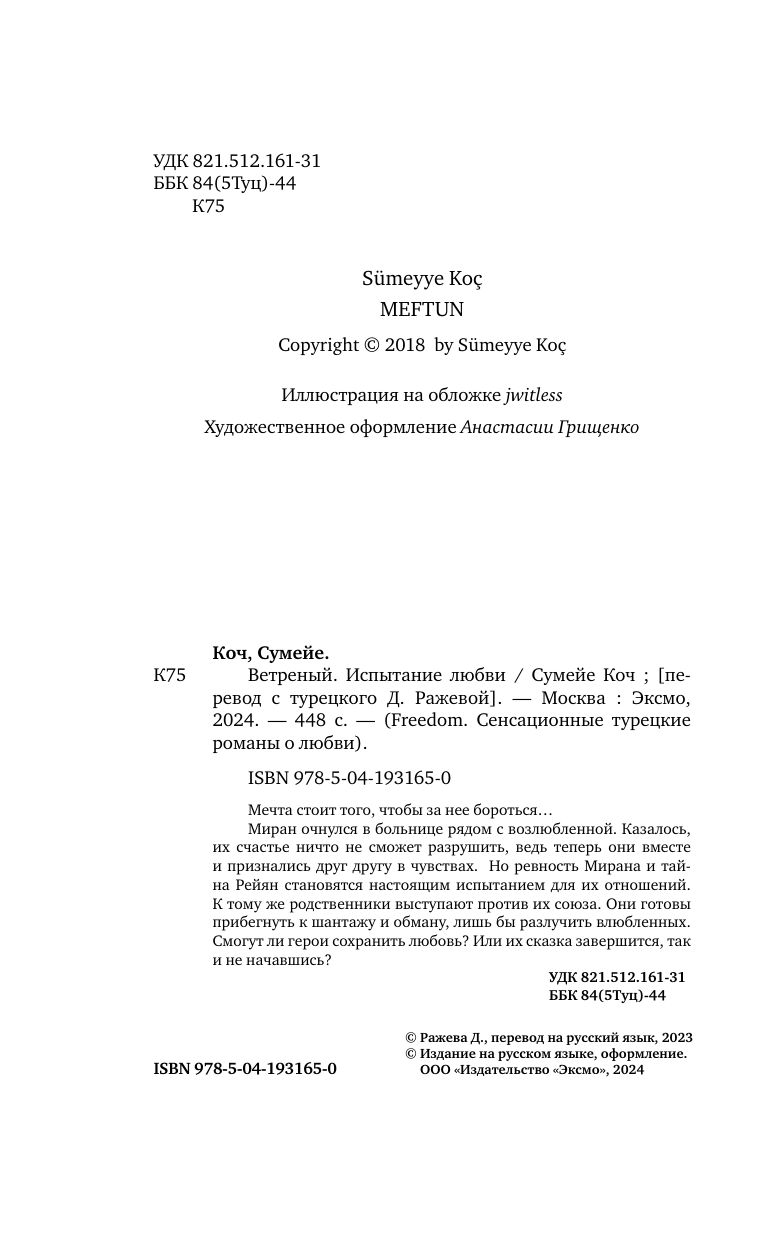 Завершающая часть нашумевшей дилогии «Ветреный», легшей в основу культового турецкого телесериала и покорившей сердца читателей по всему миру! История любви, родившейся из мести! История любви двух противоположностей, неотвратимо тянущихся друг к другу! Остросюжетная мелодрама о чувствах, прощении и мести. Атмосферное внутреннее оформление с национальными турецкими элементами! Потрясающей красоты обложка и запечатанные форзацы! Миран очнулся в больнице рядом с возлюбленной. Казалось, их счастье ничто не сможет разрушить, ведь теперь они вместе и признались друг другу в чувствах. Но ревность Мирана и тайна Рейян становятся настоящим испытанием для их отношений. К тому же, родственники выступают против их союза. Они готовы прибегнуть к шантажу и обману, лишь бы разлучить влюбленных. Смогут ли герои сохранить любовь? Или их сказка завершится, так и не начавшись?