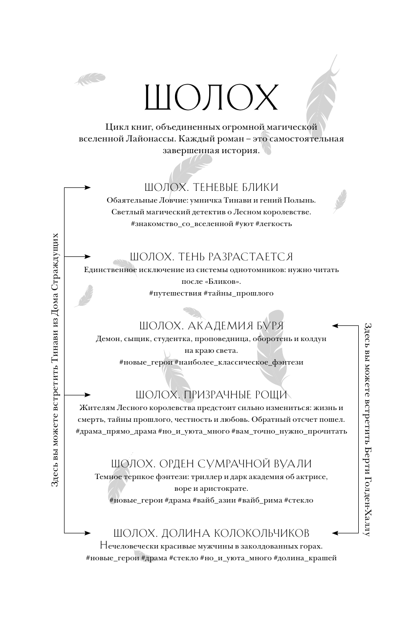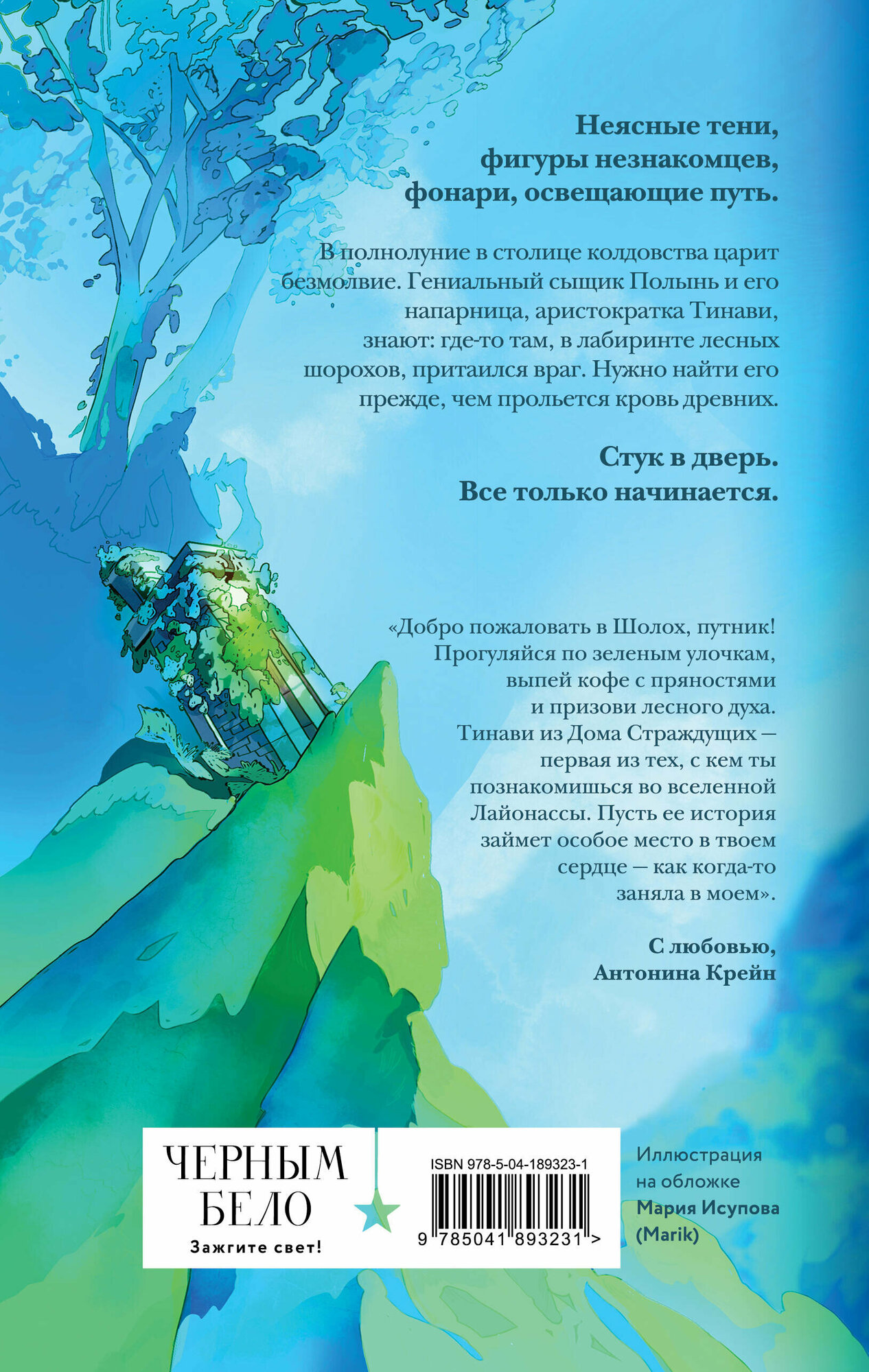 Тинави живет в столице колдовства, но напрочь лишилась магии. Теперь на ее будущем можно поставить крест. Но в полнолуние она спасает странного мальчишку с амнезией, а следующим утром внезапно получает работу Ловчей - детектива по делам чужестранцев. В паре с магом Полынью Тинави предстоит отыскать убийцу, орудующего в самом сердце королевства - во дворце. Постепенно девушка убеждается, что на магии свет клином не сошелся. Только вот незадача: все ее новые знакомые - не те, кем кажутся на первый взгляд. В комплект входит первая часть популярнейшего фэнтези-цикла "Шолох" Антонины Крейн и тетрадь в клетку с изображением главной героини магической вселенной Лайонассы. Фантастически мир "Шолоха" высоко оценен книжными блогерами. Совокупный тираж цикла "Шолох" более 80 000 экземпляров! Сочетание фэнтези, детектива, приключений в огромной вселенной под одной обложкой. Тинави потеряла магию, но ее приключения в столице колдовства только начинаются.