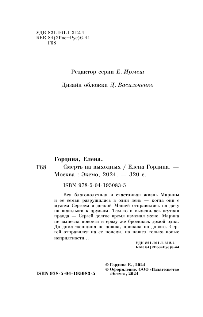 Книга: Смерть на выходных (Елена Гордина); Эксмо, Редакция 1, 2024
