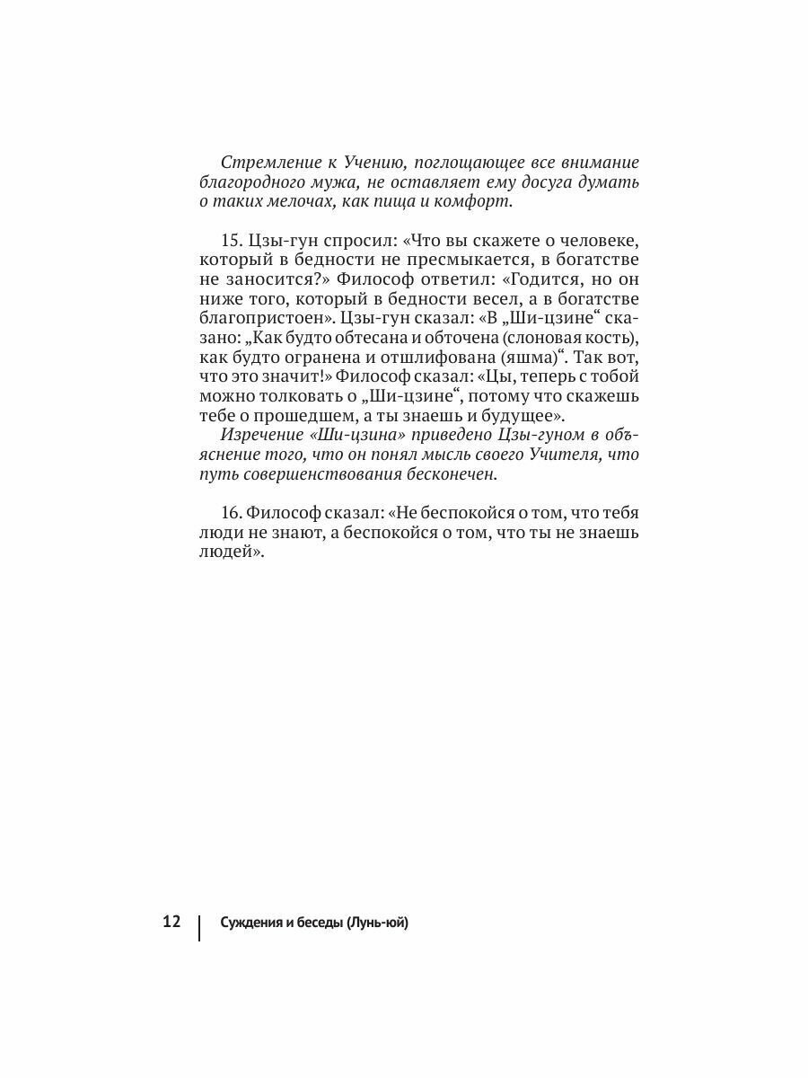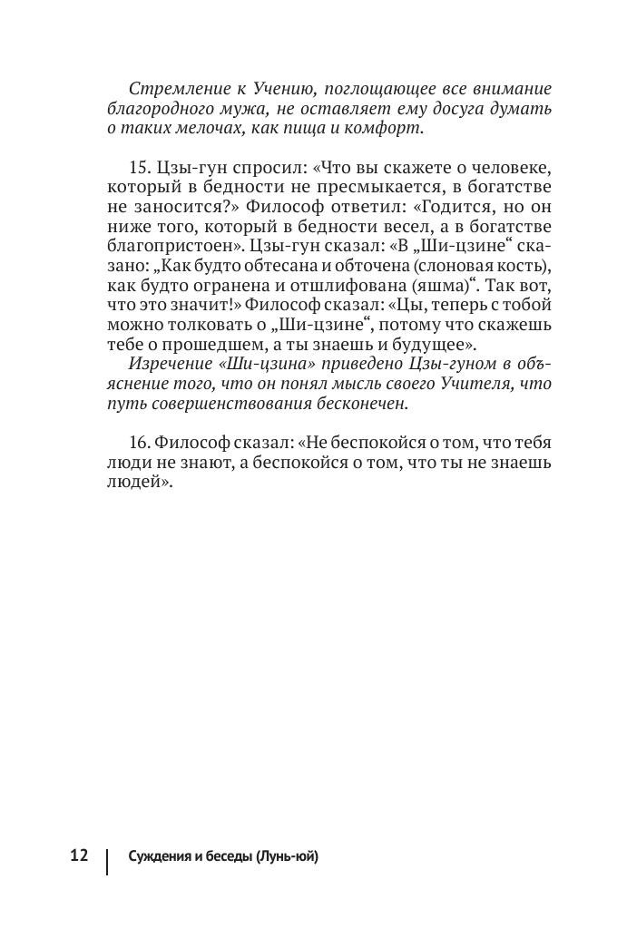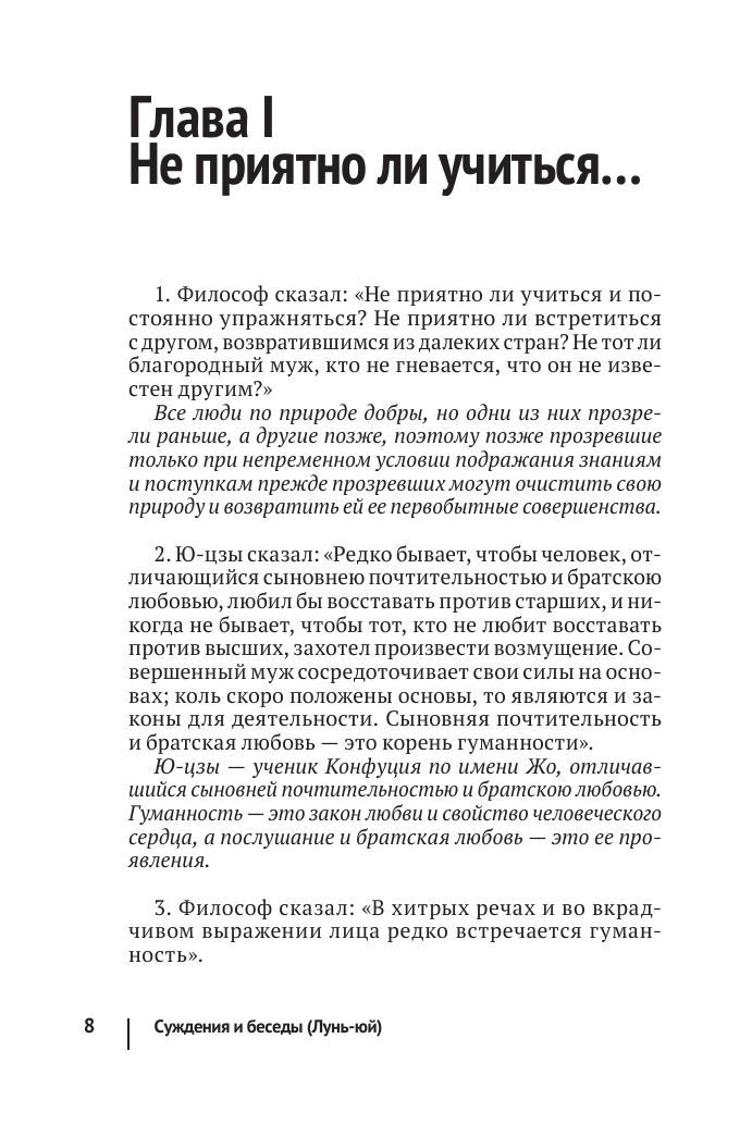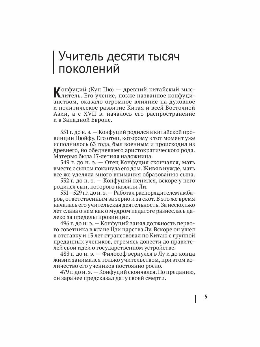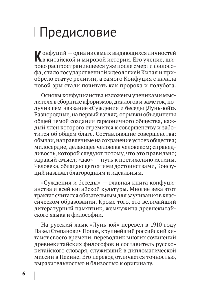 "Суждения и беседы" Конфуция - главная книга конфуцианства и, пожалуй, магистральный философский трактат всей китайской культуры. Многие века этот текст считался обязательным для заучивания в классическом образовании. Кроме того, это величайший литературный памятник, жемчужина древнекитайского языка и философии. Он знакомит читателя с мыслями одного из величайших учителей древности - Конфуция - чьи уроки стойкости, благородства и житейской мудрости не теряют актуальности по сей день. Книга входит в обязательную программу курса философии, а также будет полезна всем, кто интересуется историей и культурой Китая, Азии, историей философских учений. Серия "Великие идеи" представляет собой библиотеку выдающихся образцов человеческой мысли. В нее вошли ключевые труды мыслителей всех времен и народов, актуальные во все времена. Главные произведения философов с древнейших времен - от Конфуция и Платона до Фрейда и Ницше - откроют лучшие идеи мировой философии и помогут отыскать путь к самому себе.