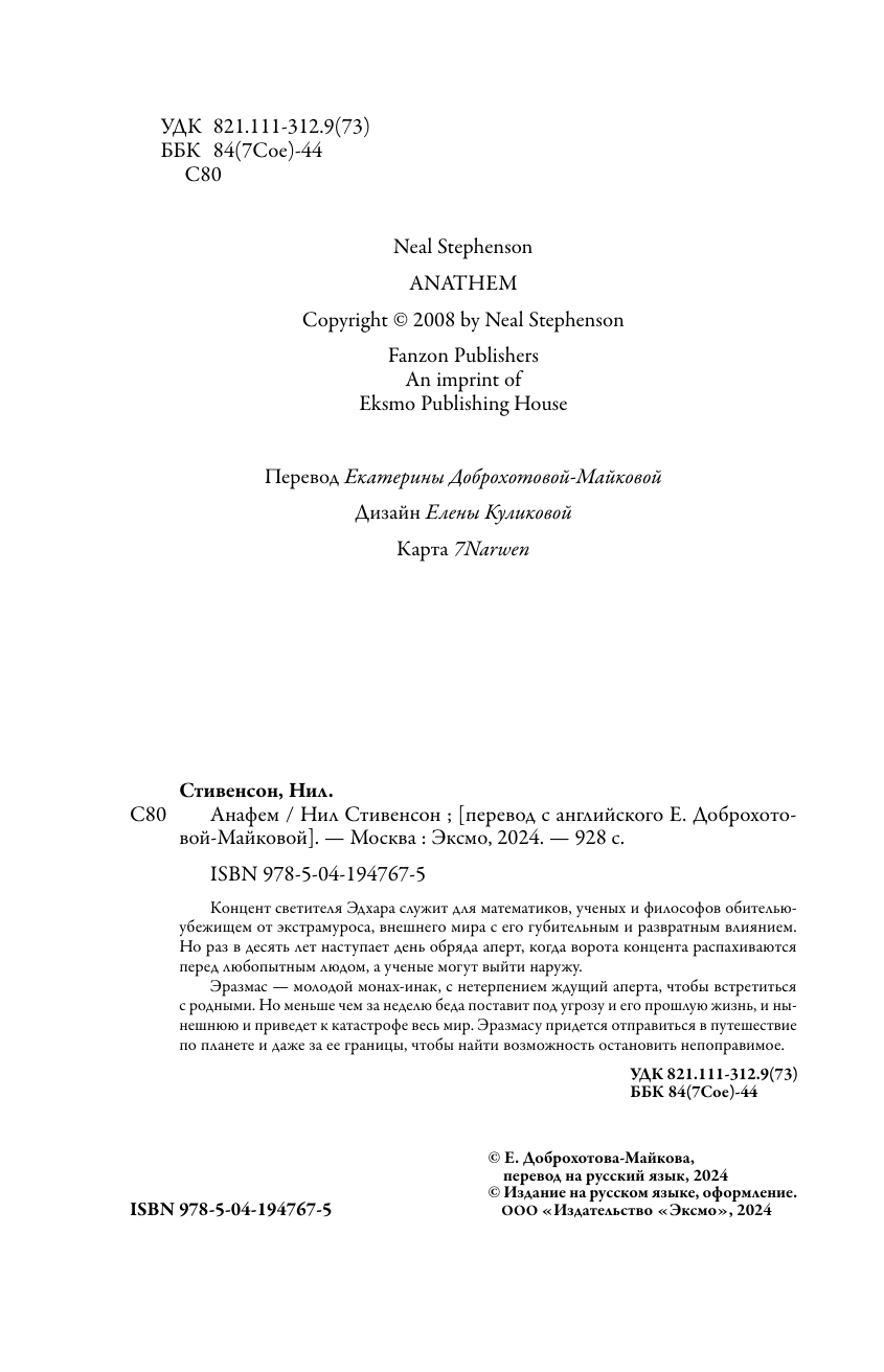 Книга: Анафем (Нил Стивенсон); Эксмо, Fanzon, Редакция 1, 2024
