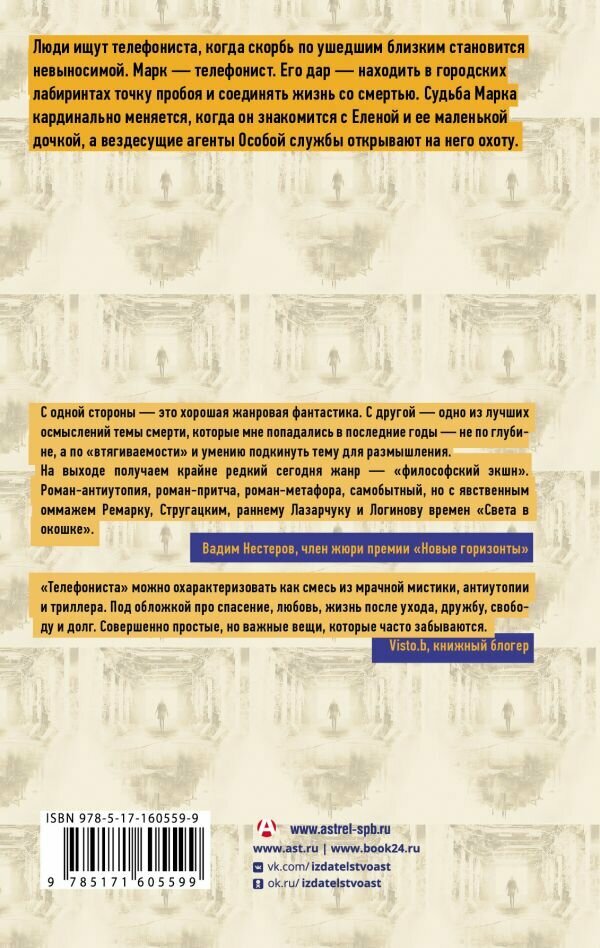 Люди ищут телефониста, когда скорбь по ушедшим близким становится невыносимой. Марк — телефонист. Его дар — находить в городских лабиринтах точку пробоя и соединять жизнь со смертью. Судьба Марка кардинально меняется, когда он знакомится с Еленой и ее маленькой дочкой, а вездесущие агенты Особой службы открывают на него охоту.
