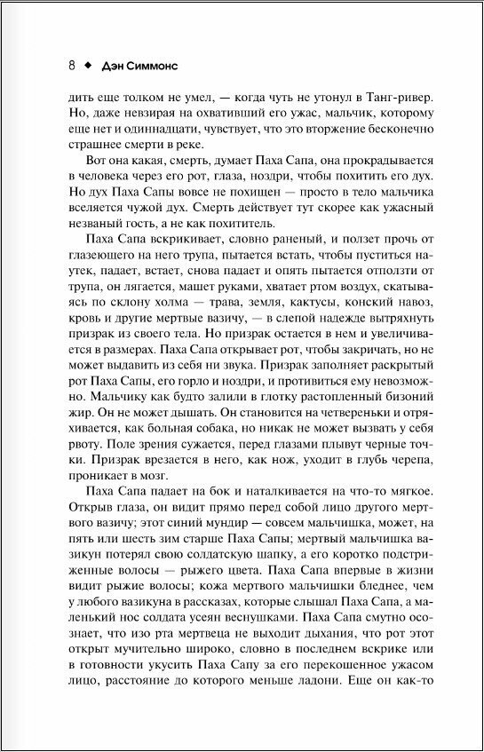 1876 год. Во время знаменитой битвы на реке Литтл-Бигхорн в индейского мальчика из племени лакота вселяется дух только что погибшего легендарного генерала Кастера. Юнец чудесным образом обретает способность слышать не только голос и воспоминания собственно Кастера, но и окунуться в воспоминания любого другого человека, к которому прикоснется. Что же принесет эму этот дар – радость познания или жестокое разочарование? В одном из самых серьезных своих романов Дэн Симмонс рассказывает историю формирования американского духа, американской мечты на фоне грандиозных событий, настоящих вех ХIХ – ХХ веков: открытия знаменитой чикагской Всемирной выставки 1893 года, постройки Бруклинского моста, работы по созданию бюстов президентов на горе Рашмор и многого другого...