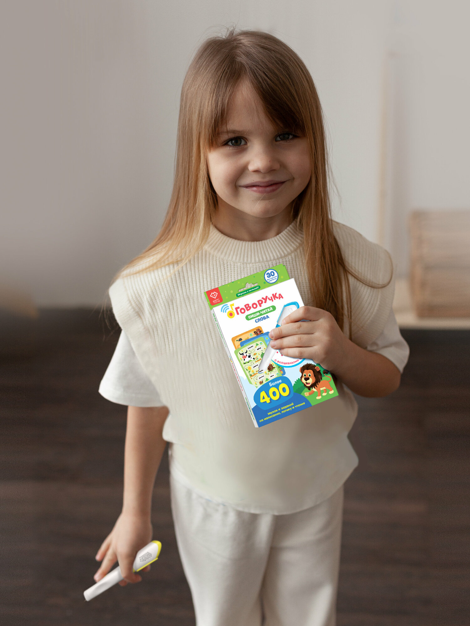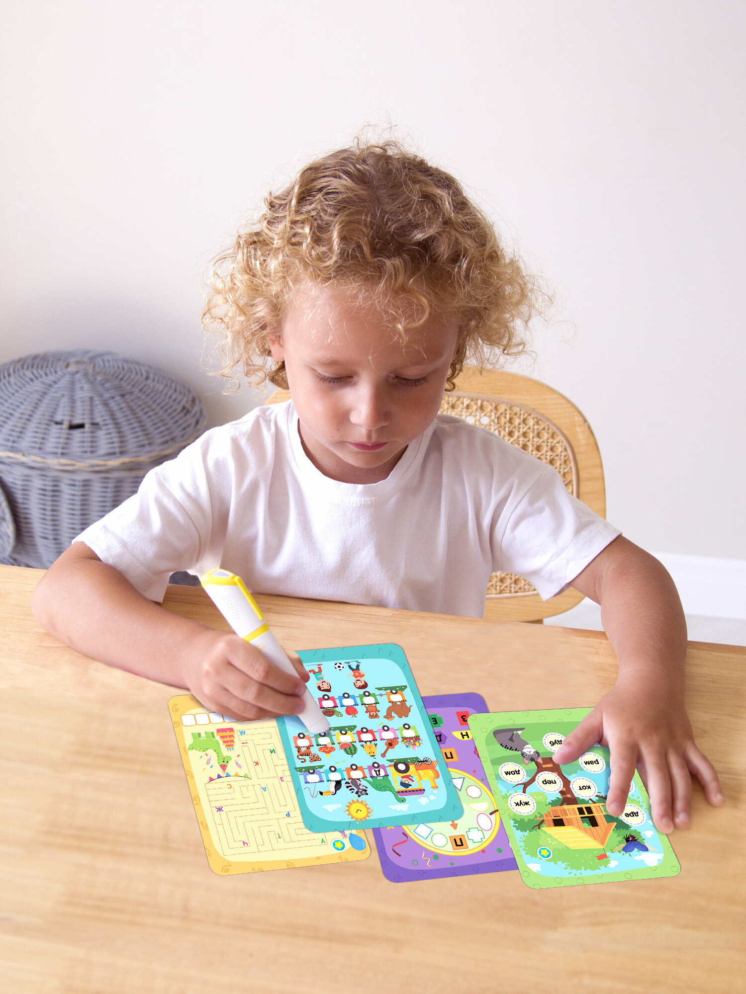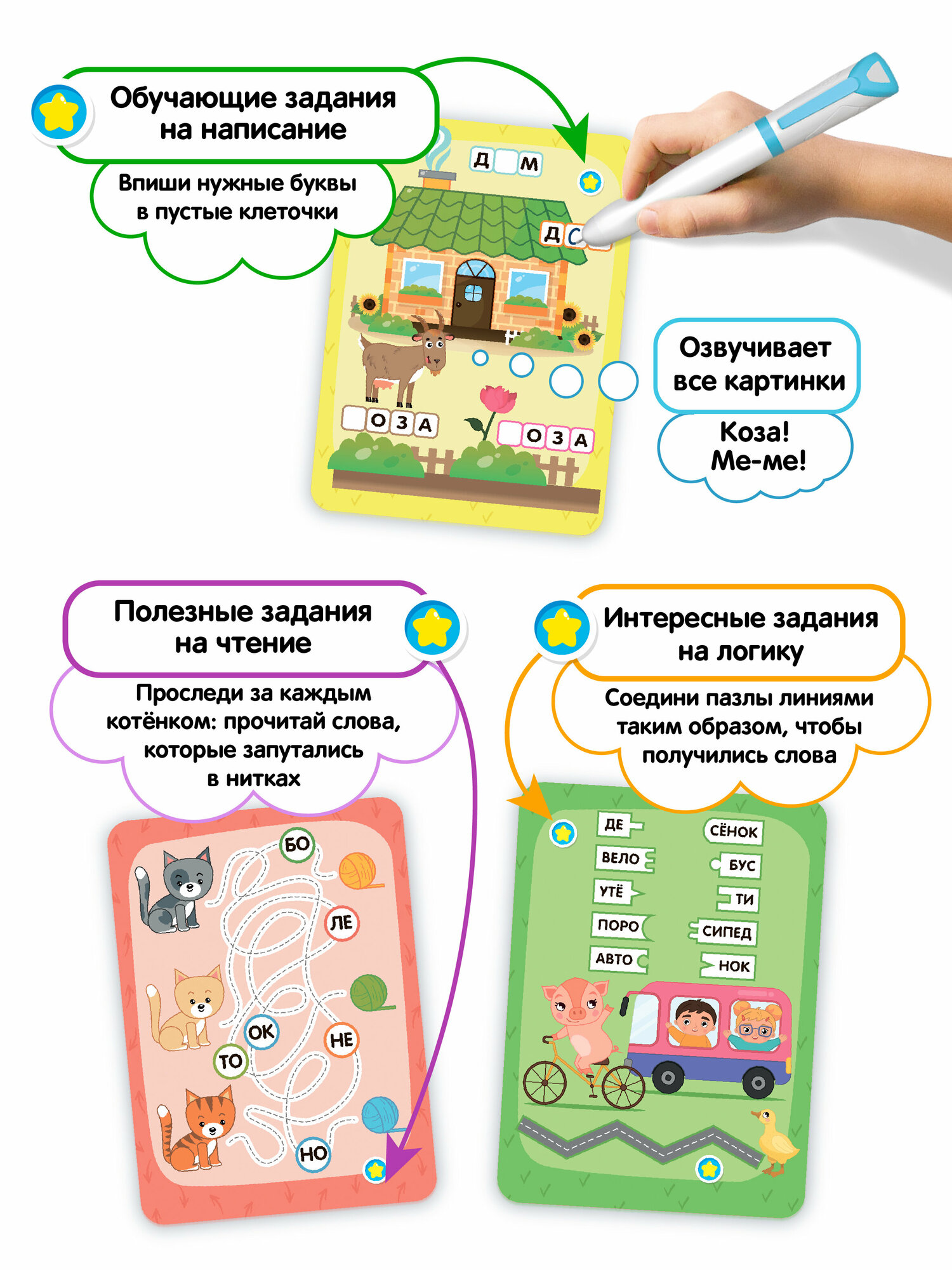 В карточках собрано более 400 звуков, заданий и прописей. Уникальная особенность — возможность писать в книге исчезающими чернилами, которые испаряются со станиц через 5–10 минут. Это позволит повторно выполнять задания неограниченное количество раз и не бояться совершить ошибки. Многоразовых прописей хватит надолго.