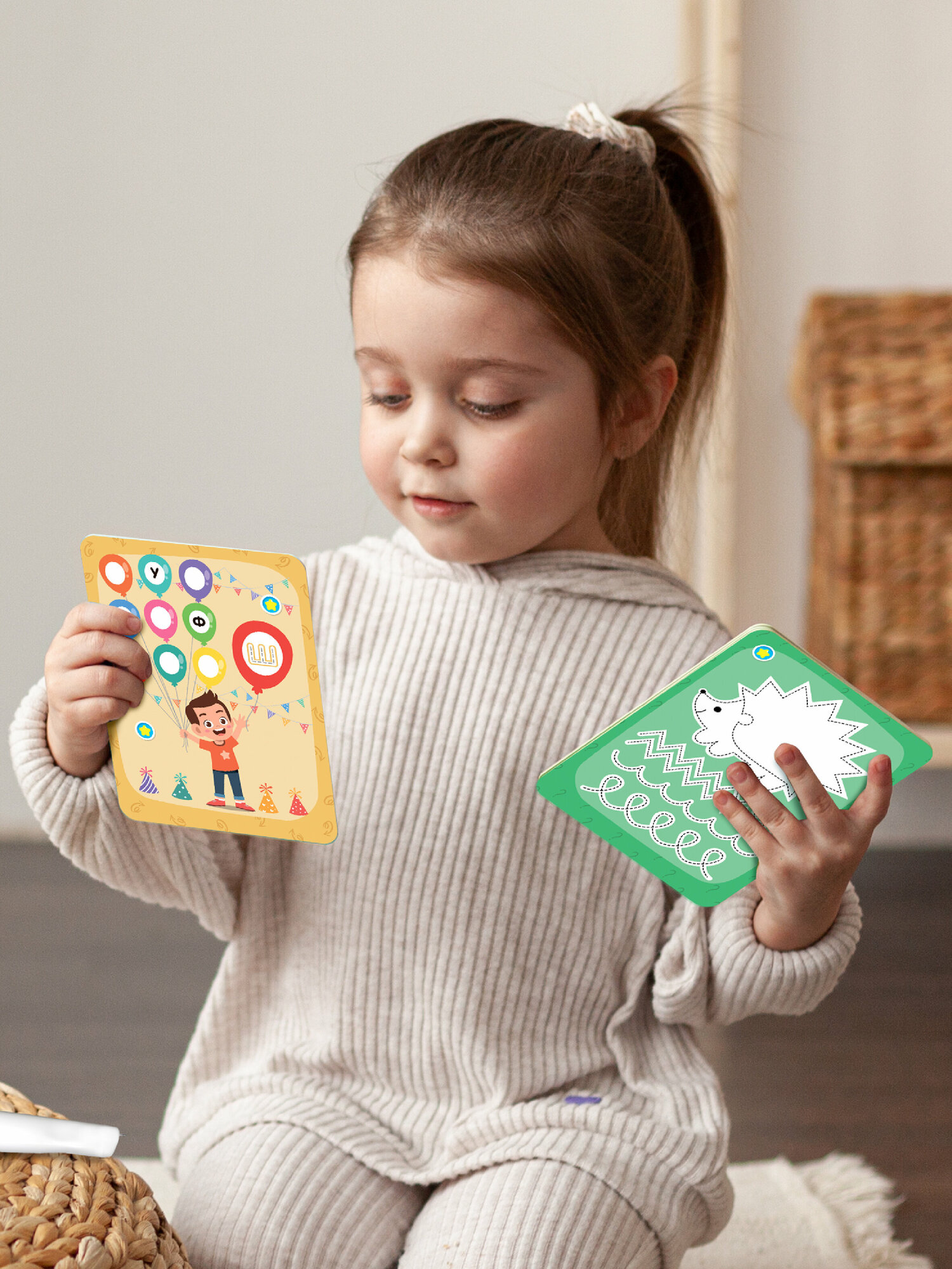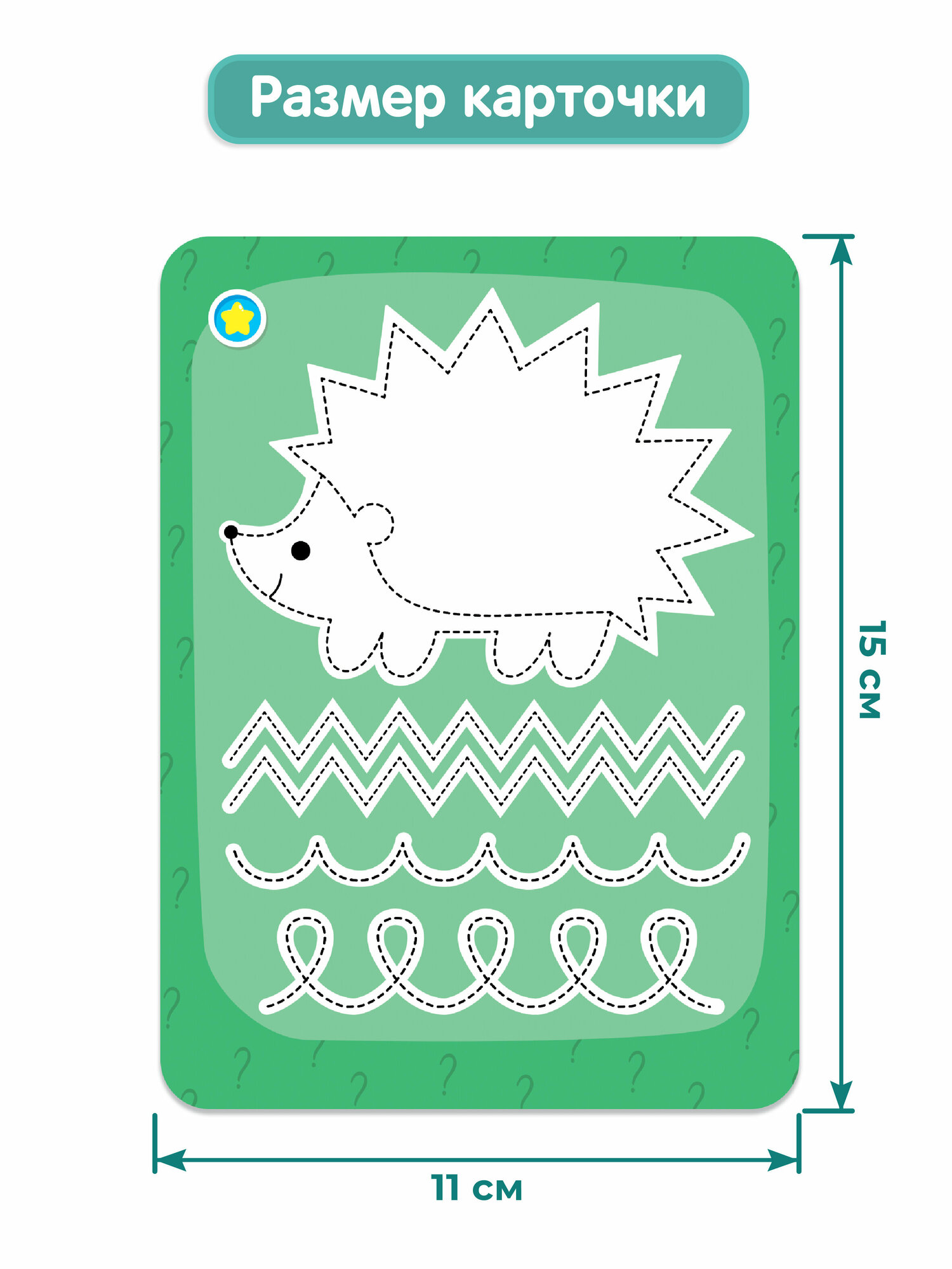 30 больших двусторонних карт из плотного картона подойдут для частого использования. Вас ждут обучающие игры разных уровней сложности для развития мелкой моторики и подготовке руки для письма, тренировки усидчивости, внимания, аккуратности.