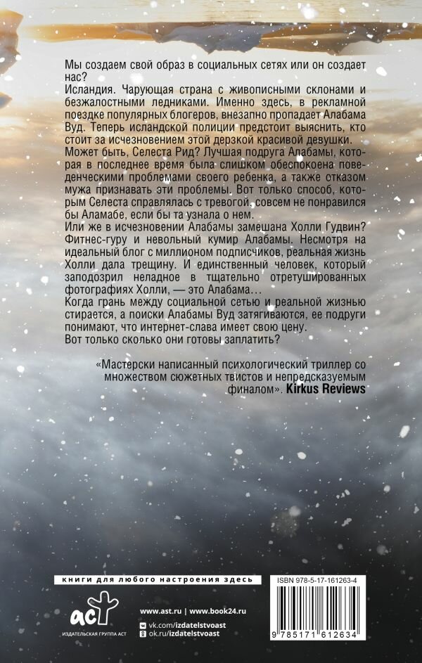 Мы создаем свой образ в социальных сетях или он создает нас? Исландия. Чарующая страна с живописными склонами и безжалостными ледниками. Именно здесь, в рекламной поездке популярных блогеров внезапно пропадает Алабама Вуд. Теперь исландской полиции предстоит выяснить, кто стоит за исчезновением этой дерзкой красивой девушки. Может быть, Селеста Рид? Лучшая подруга Алабамы, которая в последнее время была слишком обеспокоена поведенческими проблемами своего ребенка, а также отказом мужа признавать эти проблемы. Вот только способ, которым Селеста справлялась с тревогой, совсем не понравился бы Аламабе, если бы та узнала о нем. Или же в исчезновении Алабамы замешана Холли Гудвин? Фитнес-гуру и невольный кумир Алабамы. Несмотря на идеальный блог с миллионом подписчиков, реальная жизнь Холли дала трещину. И единственный человек, который заподозрил неладное в тщательно отретушированных фотографиях Холли, — это Алабама… Когда грань между социальной сетью и реальной жизнью стирается, а поиски Алабамы Вуд затягиваются, ее подруги понимают, что интернет-слава имеет свою цену. Вот только сколько они готовы заплатить?