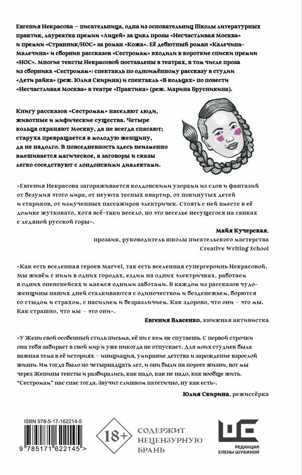 Евгения Некрасова — писательница, одна из основательниц Школы литературных практик, лауреатка премии «Лицей» за цикл прозы «Несчастливая Москва» и премии «Странник/НОС» за роман «Кожа». Её дебютный роман «Калечина-Малечина» и сборник рассказов «Сестромам» входили в короткие списки премии «НОС». Многие тексты Некрасовой поставлены в театрах, в том числе проза из сборника «Сестромам»: спектакль по одноименному рассказу в студии «Дети райка» (реж. Юлия Скирина) и спектакль «В кольцах» по повести «Несчастливая Москва» в театре «Практика» (реж. Марина Брусникина). Книгу рассказов «Сестромам» населяют люди, животные и мифические существа. Четыре кольца охраняют Москву, да не всегда спасают; старуха превращается в молодую женщину, да не надолго. В повседневность здесь неизменно вмешивается магическое, а заговоры и сказы легко соседствуют с лондонскими диалектами. «Евгения Некрасова загораживается колдовскими узорами из слов и фантазий от безумия этого мира, от неуюта тесных квартир, от покинутых детей и стариков, от измученных пассажиров электричек. Стоять с ней вместе в её домике жутковато, хотя всё-таки весело, но это веселье несущегося на санках с ледяной русской горы». Майя Кучерская, прозаик, руководитель школы писательского мастерства Creative Writing School «Как есть вселенная героев Marvel, так есть вселенная супергероинь Некрасовой. Мы живём с ними в одних городах, ездим на одних электричках, работаем в одних опенспейсах и маемся одними заботами. В каждом из рассказов чудо-женщины наших дней сталкиваются с одиночеством и безденежьем, борются со стыдом и страхом, с насилием и безразличием. Как здорово, что они — это мы. Как страшно, что мы — это они». Евгения Власенко, книжная активистка «У Жени свой особенный стиль письма, её ни с кем не спутаешь. С первой строчки она тебя забирает в свой мир и уже никогда не отпускает. Для моих студиек была важная тема в её историях — инициация, умирание детства и зарождение взрослой жизни. Им тогда было по четырнадцать лет, и они были на пороге жизни, вот мы через Женины тексты и разбирались, как надо, как не надо, как вообще жить. “Сестромам” нас спас тогда. Звучит слишком патетично, ну как есть». Юлия Скирина, режиссёрка