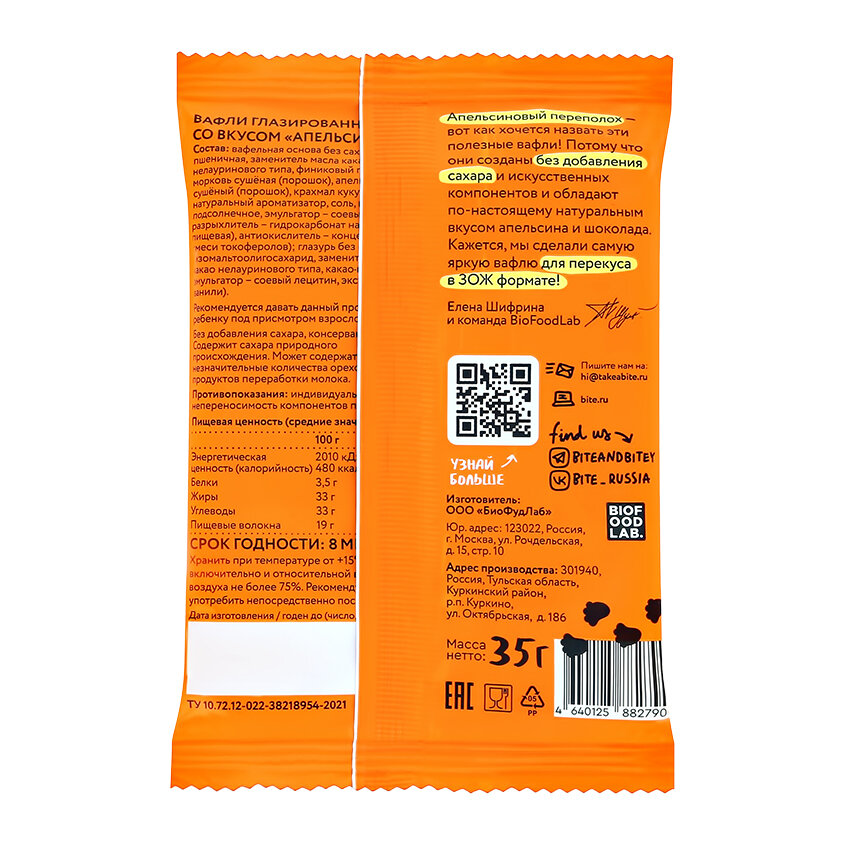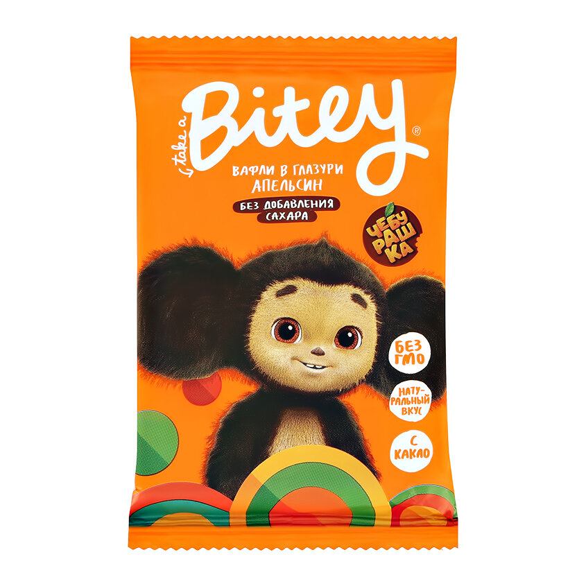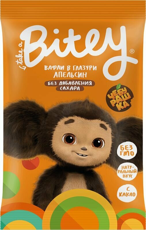Апельсиновый переполох - вот как называются эти полезные вафли! Потому что они созданы без добавления сахара и искусственных компонентов и обладают по-настоящему натуральным вкусовом апельсина и шоколада. Вафли созданы на основе пшеничной муки, финикового порошка и апельсина. Покрыты нежной шоколадной глазурью с натуральным какао. Без добавления сахара, искусственных ароматизаторов красителей. Без ГМО. Натурально сладкий перекус для самых маленьких фанатов Чебурашки. Этот снек можно взять с собой на прогулку или на праздник. В нем не содержится добавленного сахара, искусственных красителей и пальмового масла, поэтому вафли Bitey станут хорошей альтернативой другим детским сладостям.Вафли Bitey от бренда Take a Bite - это вкусное и полезное лакомство для всей семьи. Благодаря удобной упаковке детские вафли Bitey можно взять с собой на прогулку, в поездку или угощать друзей на празднике. Каждая вафля в индивидуальной упаковке. Это отличный перекус, который можно взять с собой на работу, на учебу и в школу! Удивительные вафли от Take a Bite перенесут Вас в детство и подарят хорошее настроение на весь день! Сами вафли изготавливается без использования дрожжей и яиц, поэтому продукт подходит вегетарианцам, веганам и всем тем, следит за своей фигурой и является сторонником ПП и ЗОЖ! Эти детские вафли изготовлены из тщательно подобранных натуральных ингредиентов и подходят для детского питания. Вафли упакованы в яркую коробку, которая точно понравится Вам и Вашим детям! Эта коробочка с вусняшками порадует даже самого грустного человека, а вкус точно никого не оставят равнодушным и подарит заряд сил и энергии на весь день! Продукт не содержит добавленного сахара, консервантов и искусственных красителей. Зато в нем много натуральных фруктов и овощей, которые поддерживают иммунитет, а шоколадные вафли имеют в своем составе натуральный какао-порошок, благодаря нему вафли имеют изысканный вкус и аромат!