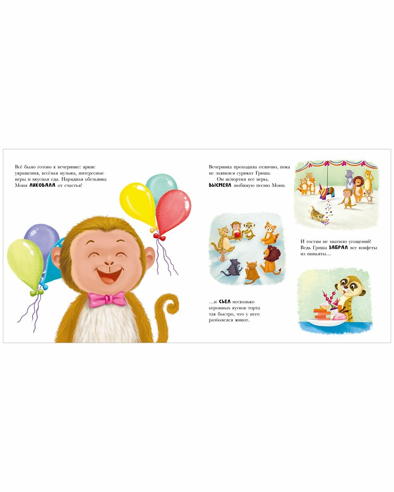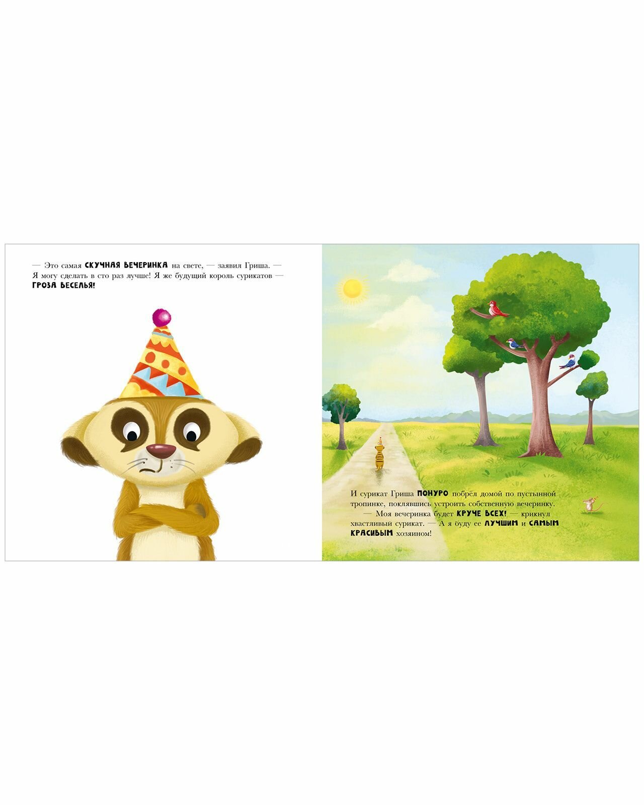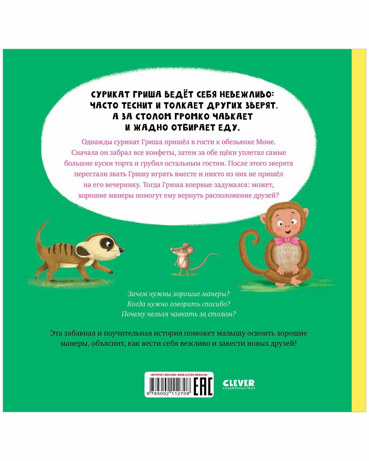 Однажды сурикат Гриша пришёл в гости к обезьянке Моне. Сначала он забрал все конфеты, затем за обе щёки уплетал самые большие куски торта и грубил остальным гостям. После этого зверята перестали звать Гришу играть вместе и никто из них не пришёл на его вечеринку. Тогда Гриша впервые задумался: может, хорошие манеры помогут ему вернуть расположение друзей?