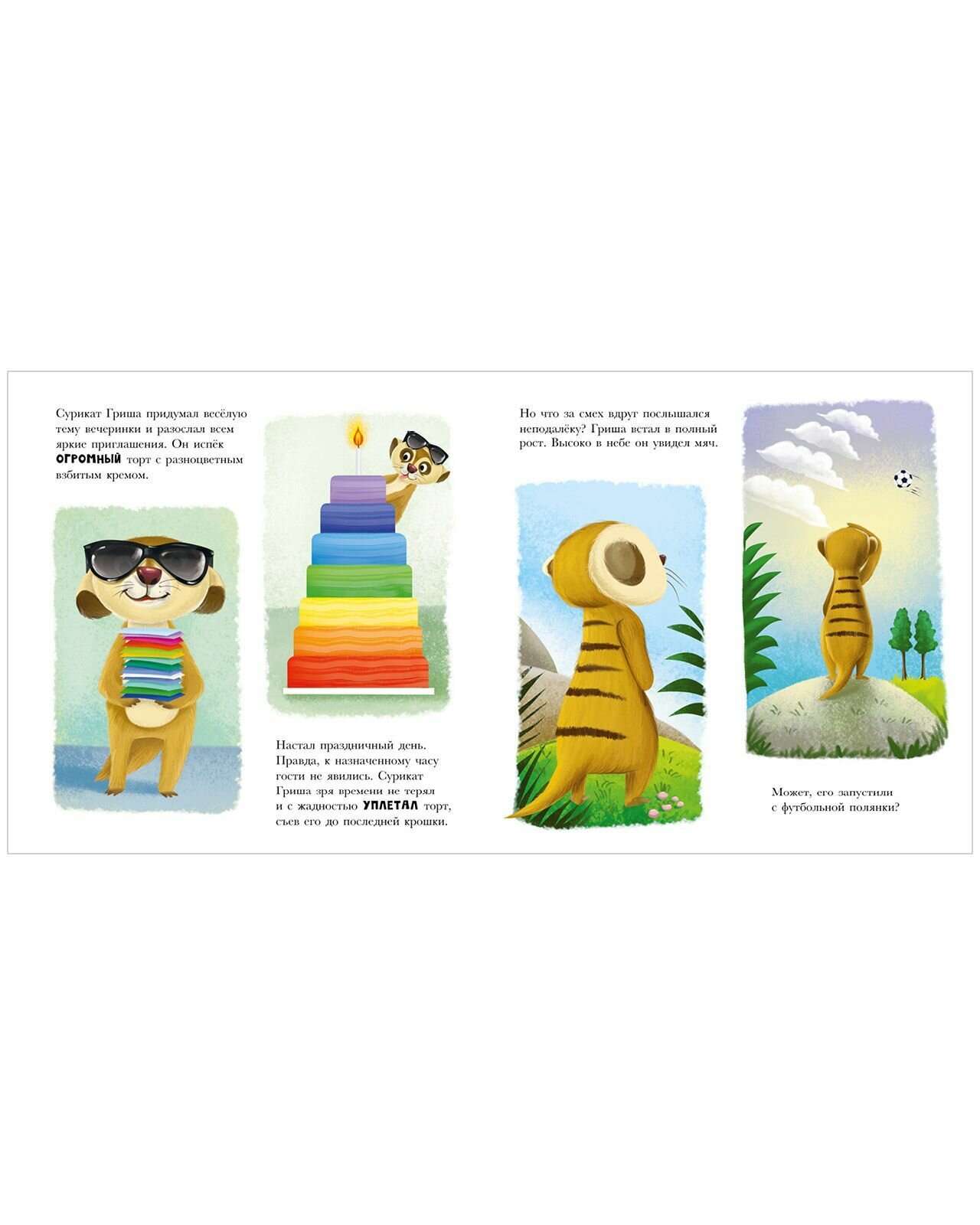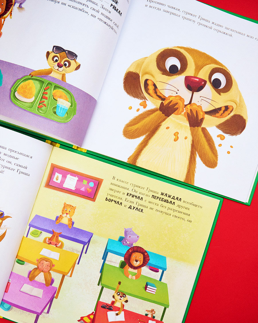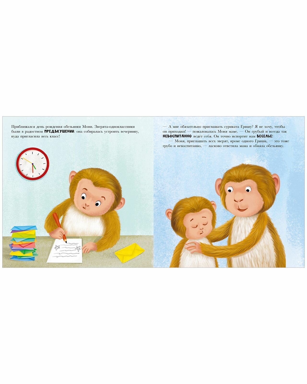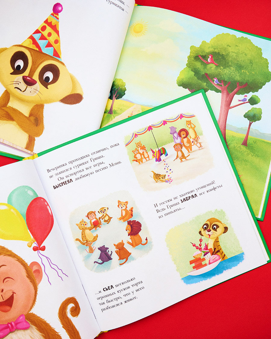 Однажды сурикат Гриша пришёл в гости к обезьянке Моне. Сначала он забрал все конфеты, затем за обе щёки уплетал самые большие куски торта и грубил остальным гостям. После этого зверята перестали звать Гришу играть вместе и никто из них не пришёл на его вечеринку. Тогда Гриша впервые задумался: может, хорошие манеры помогут ему вернуть расположение друзей?