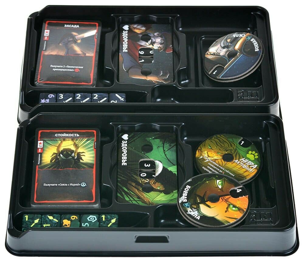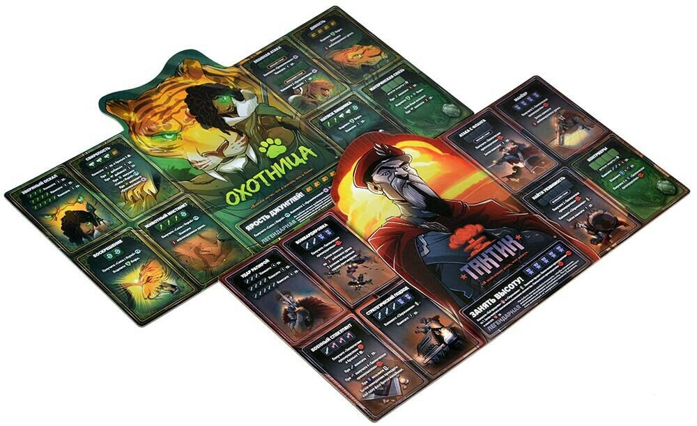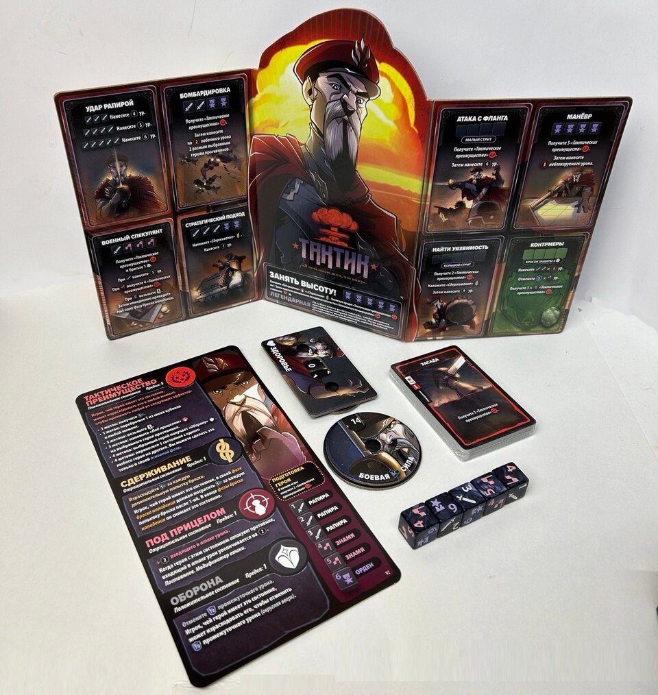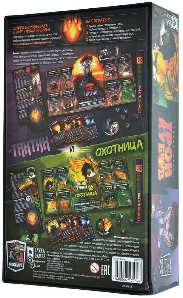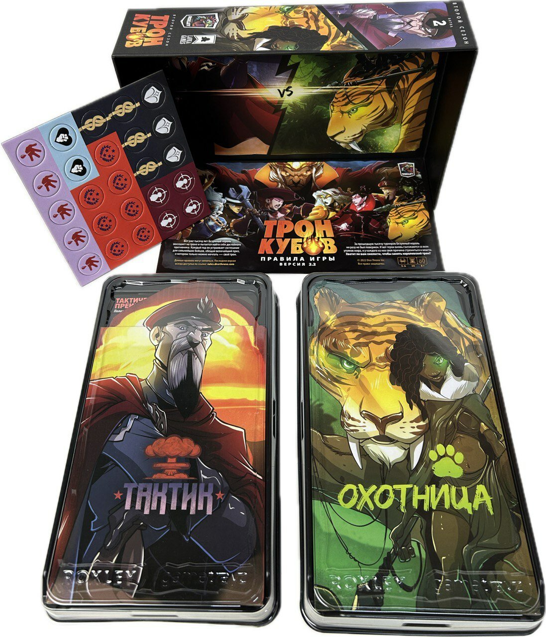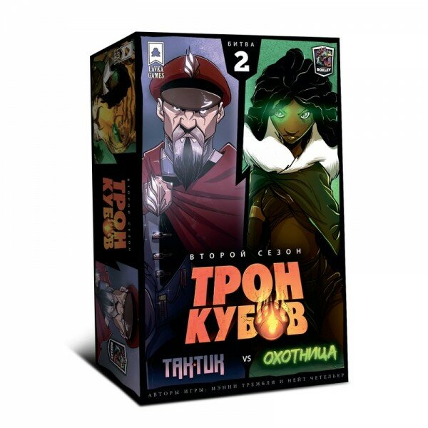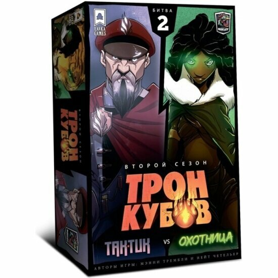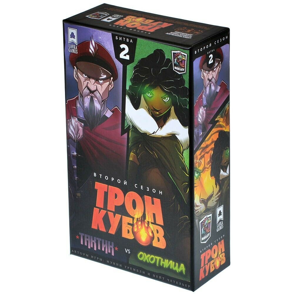 Добро пожаловать в мир «Трона Кубов». Вот уже тысячу лет Безумный король восседает на троне и пытается найти себе достойного противника. Каждый год он устраивает состязание для сильнейших бойцов, обещая величайший приз, о котором только можно мечтать – свой трон. За прошедшую тысячу турниров Безумный король ни разу не был повержен. И вот герои вновь съезжаются со всех уголков мира, и у каждого из них своя причина стремиться к власти.«Трон кубов» — быстрая азартная игра, в которой вам предстоит с умом использовать карты и кубики. Партия длится несколько раундов, во время каждого из которых вы будете бросать кубики вашего героя до 3 раз, а затем использовать комбинацию выпавших символов или чисел, чтобы активировать его способности и атаковать противника(-ов). Чтобы победить в игре, сразите противников, снизив их здоровье до 0.«Трон кубов. Второй сезон» — это 8 новых героев с особыми свойствами и способностями. Любая отдельная коробка — это готовая пара героев для жаркой дуэли. Объедините несколько коробок и устройте эпичные битвы с участием сразу нескольких героев в индивидуальном («Царь горы») и командных (по 2 или 3 человека с каждой стороны) режимах игры. Объединив коробки первого и второго сезона, вы получите более сотни различных сочетаний героев и сможете устраивать самые невероятные и легендарные битвы!В этой коробке вас ждёт два невероятных героя. Встречайте Тактик и Охотница.