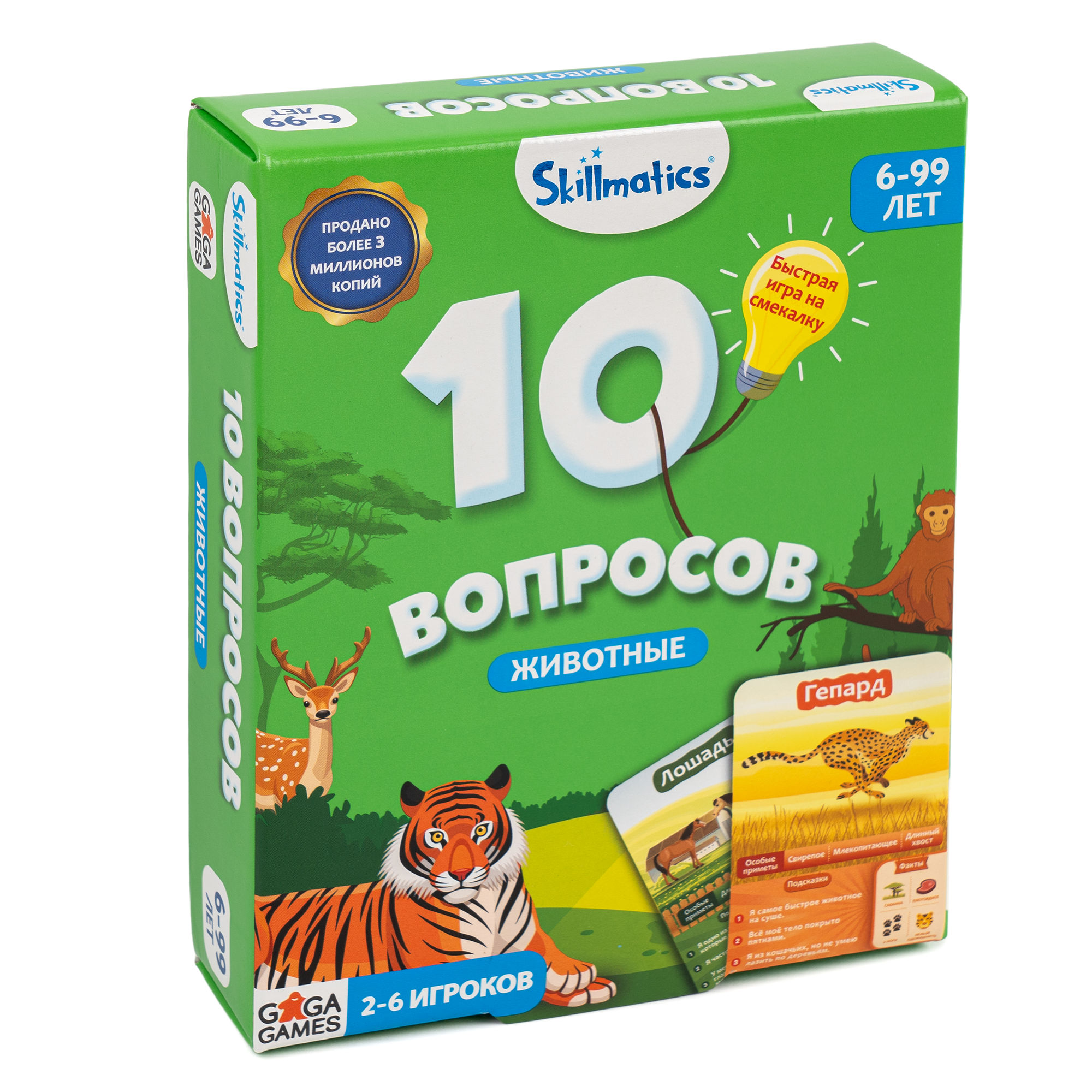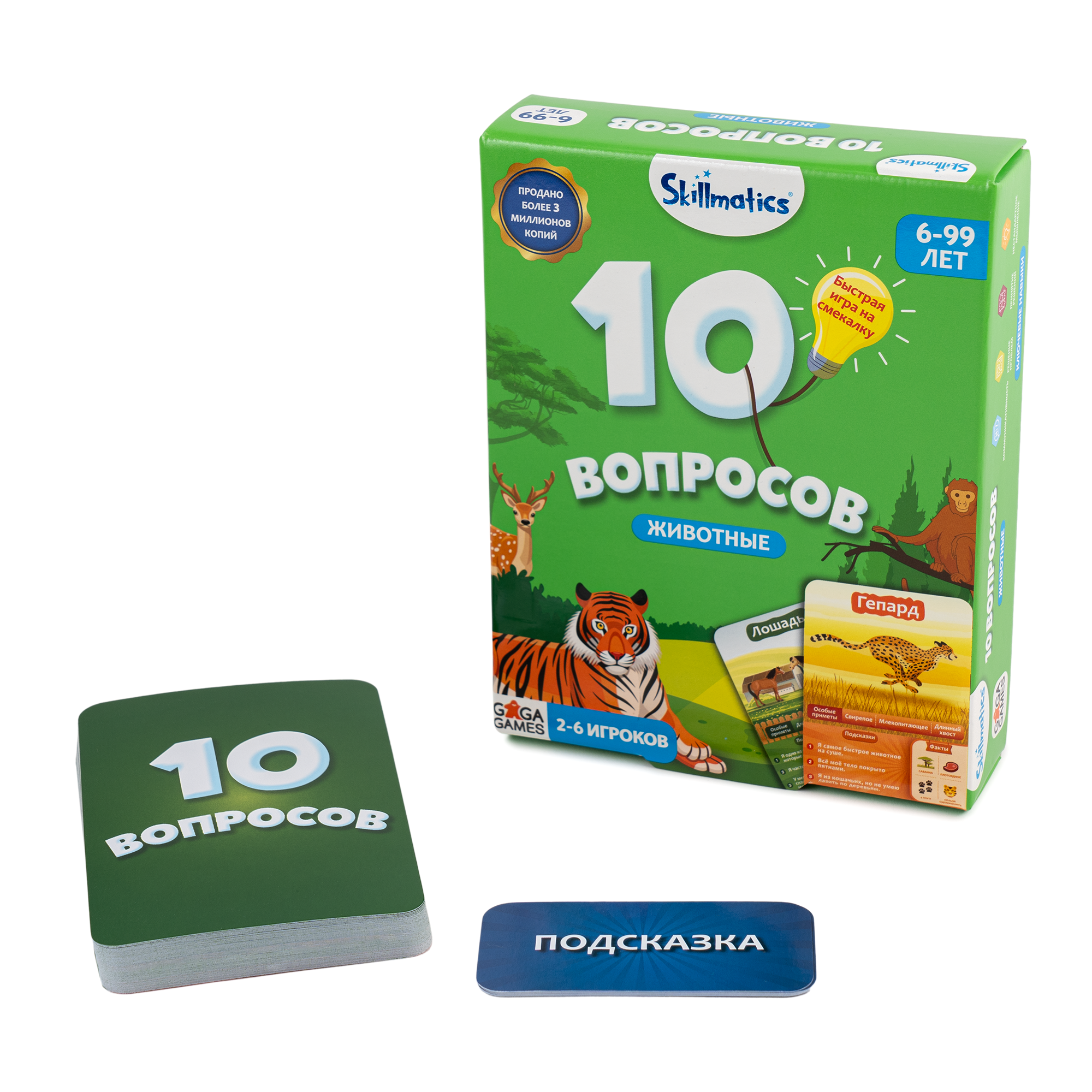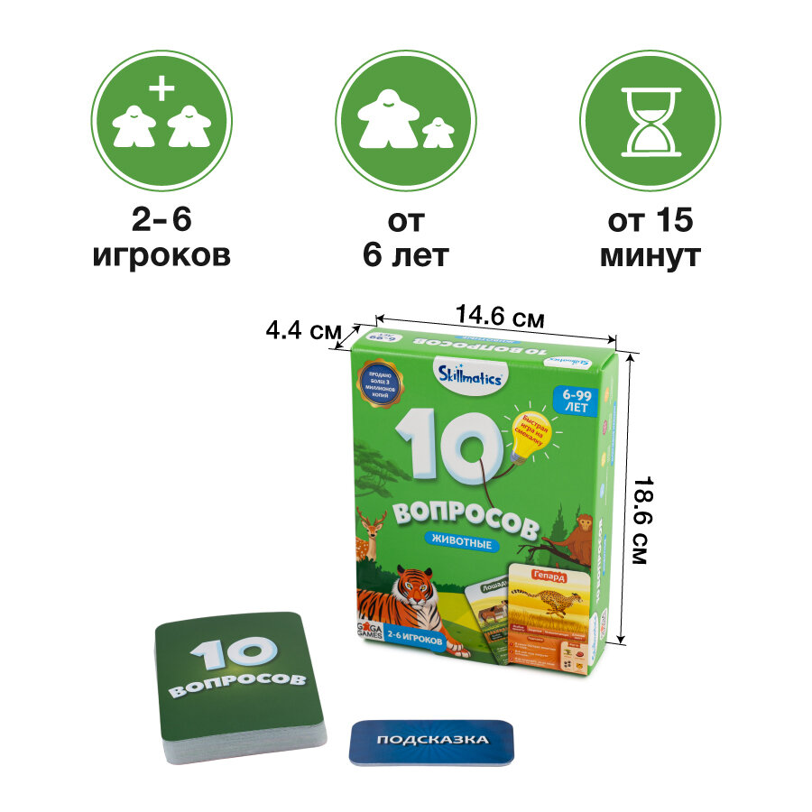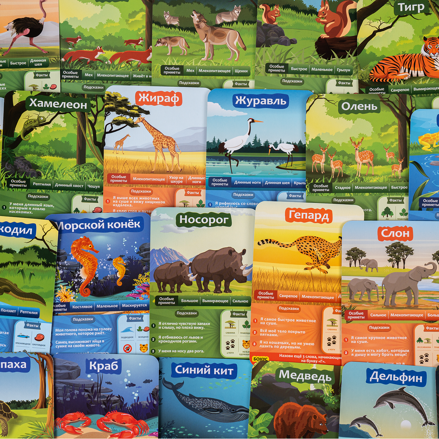 10 вопросов. Животные это развивающая настольная игра - викторина, в ходе которой вам предстоит задавать наводящие вопросы и стараться быстрее всех отгадать, какое же животное было загадано. Это плотоядное животное? Умеет ли оно летать? Задайте до 10 вопросов, отбросьте неподходящие варианты, умело задействуйте подсказки и станьте первым, кто отгадает 7 загаданных животных!
