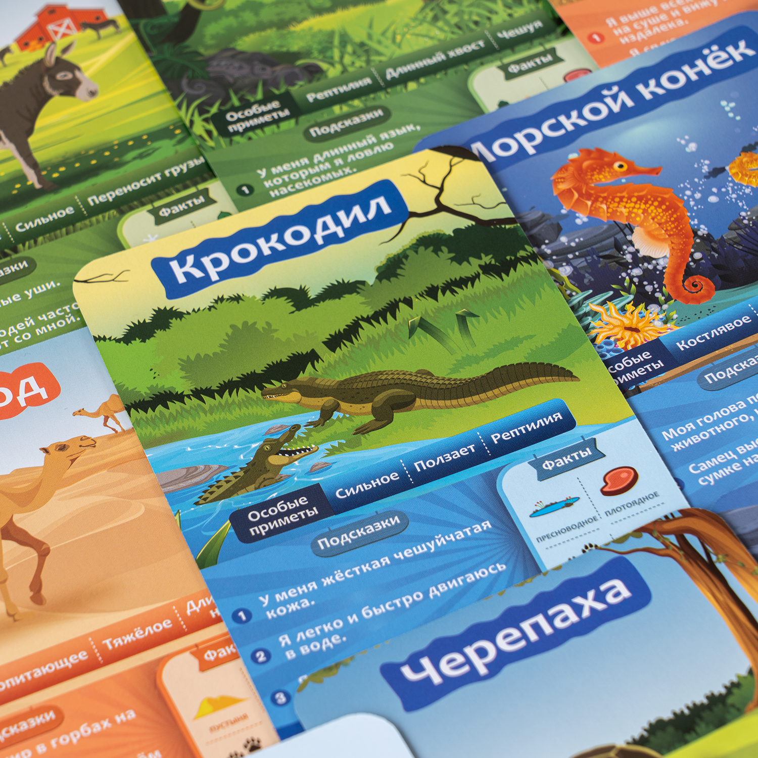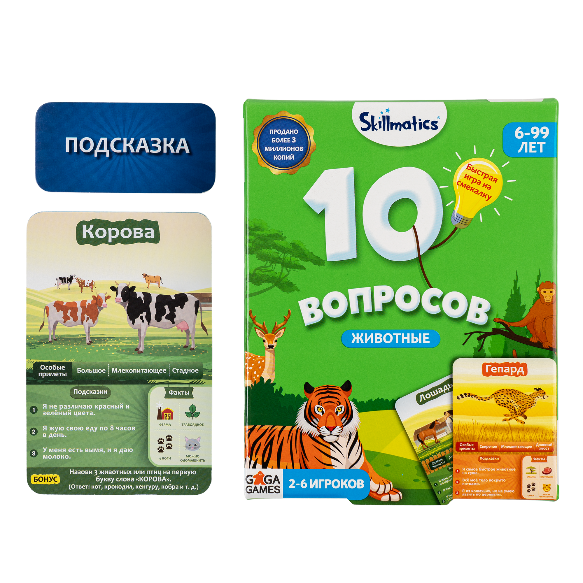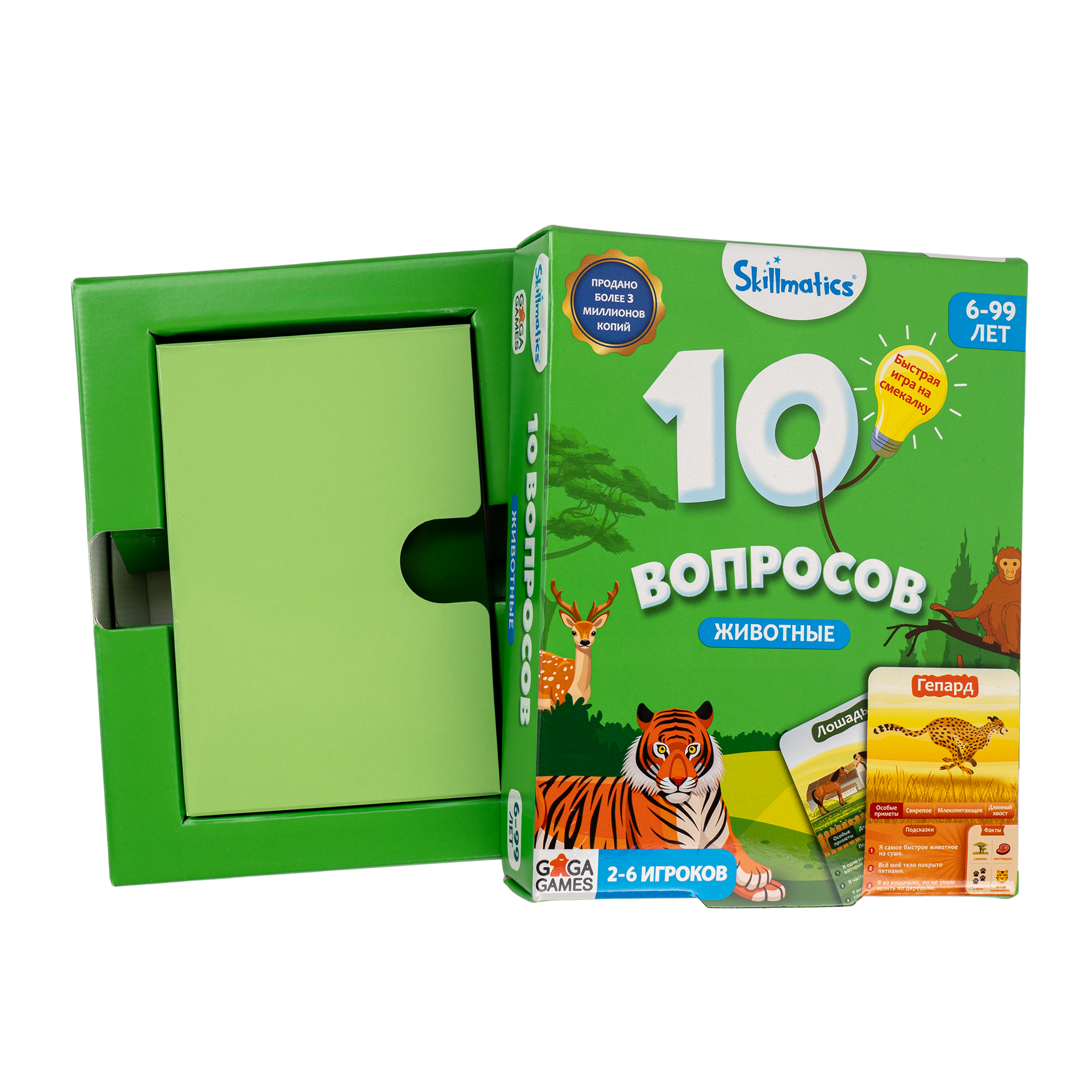 10 вопросов. Животные это развивающая настольная игра - викторина, в ходе которой вам предстоит задавать наводящие вопросы и стараться быстрее всех отгадать, какое же животное было загадано. Это плотоядное животное? Умеет ли оно летать? Задайте до 10 вопросов, отбросьте неподходящие варианты, умело задействуйте подсказки и станьте первым, кто отгадает 7 загаданных животных!
