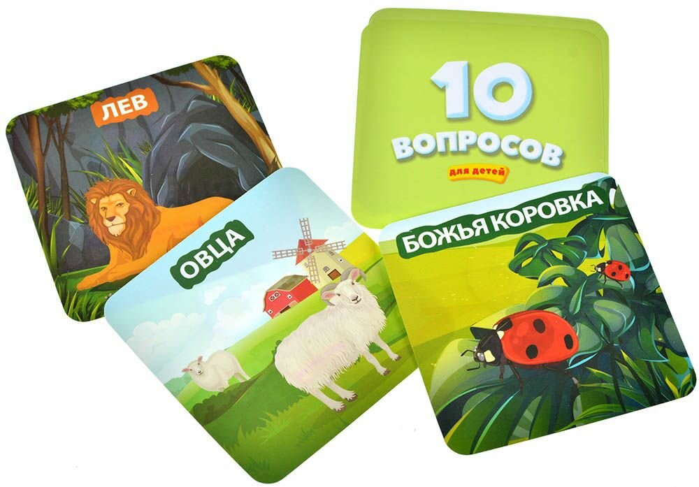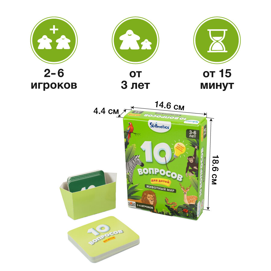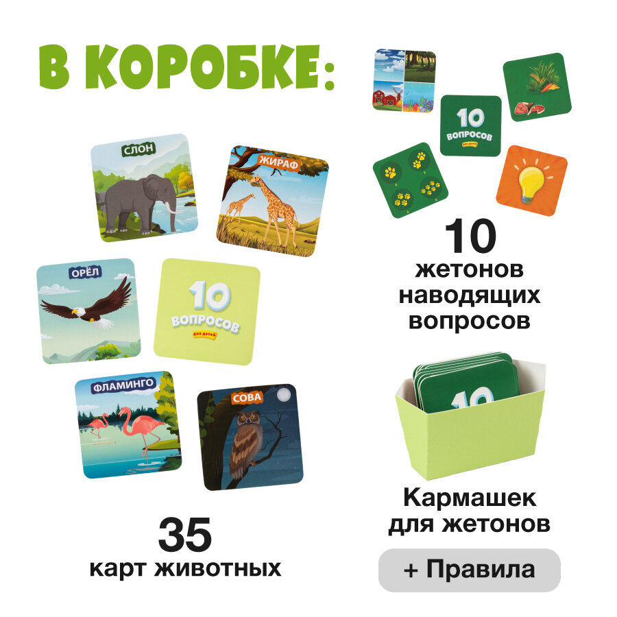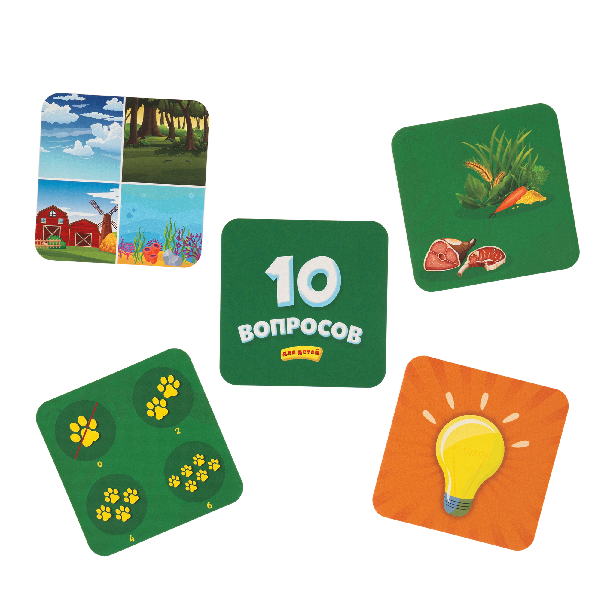10 вопросов для детей. Животный мир это развивающая настольная игра - викторина, в ходе которой вам предстоит задавать наводящие вопросы и стараться быстрее всех отгадать, какое же животное было загадано. Где живёт это животное? У этого животного 4 ноги? Чем это животное питается? Задайте до 10 вопросов, отбросьте неподходящие варианты, умело задействуйте подсказки и станьте первым, кто отгадает загаданного зверя!