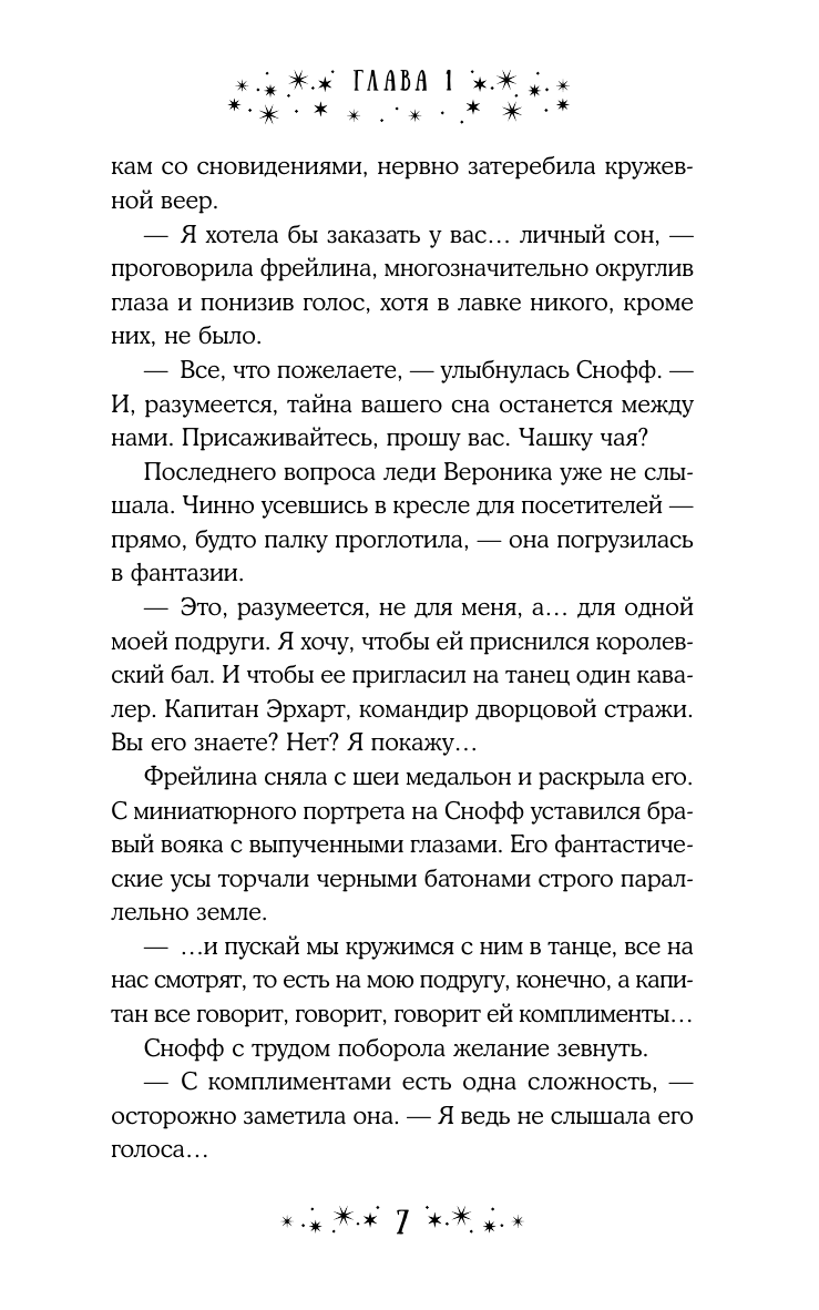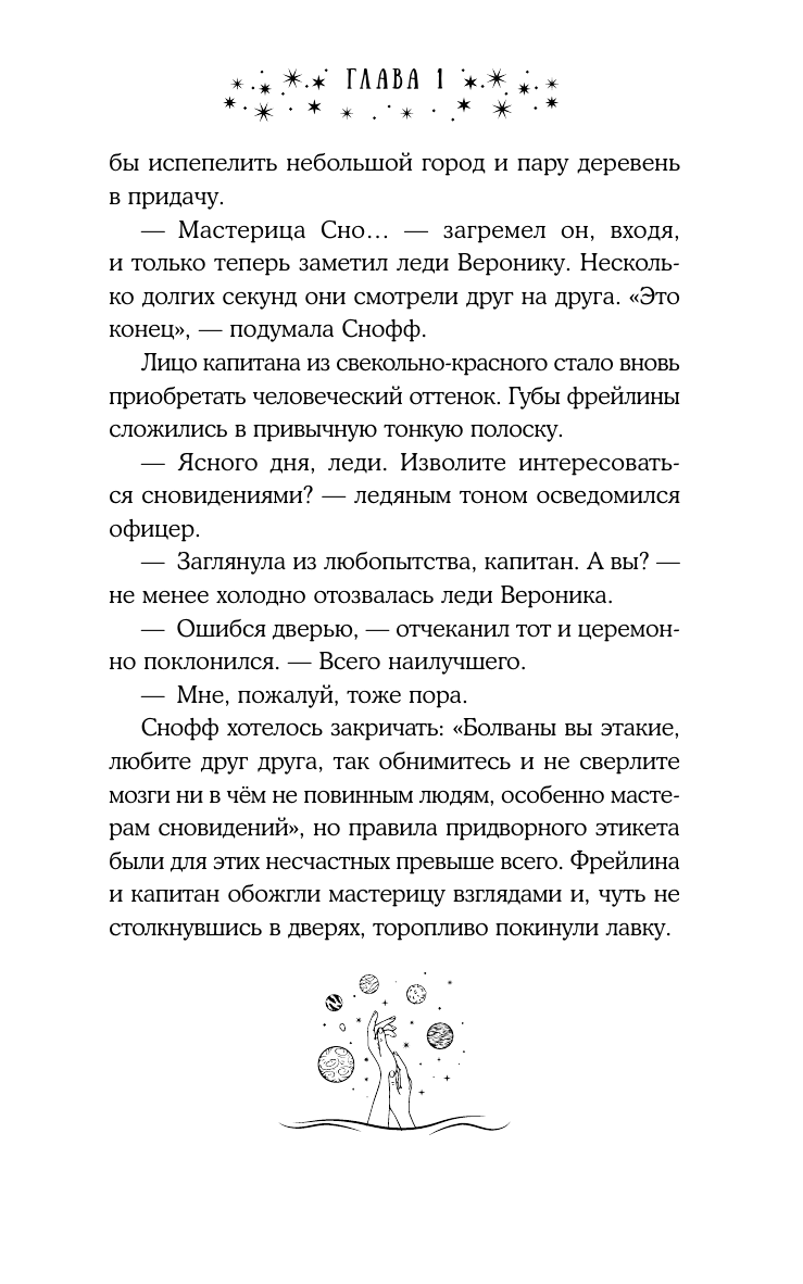 Мастера сновидений далеки от магии, их ремесло – безобидная забава для скучающих горожан. Сны юной мастерицы Снофф по праву считаются лучшими в Столице, ведь выросшая в приюте девочка знает цену доброй сказке. Но даже лучшие не застрахованы от ошибок, и мастерица случайно нарушает главный закон Гильдии – тайну сновидения. Чтобы выплатить крупный штраф, Снофф берется создать семь кошмаров для таинственного покупателя. Она еще не знает, что ее сновидения становятся реальными, а у заказчика свои планы на судьбу Королевства. Когда пустеют целые города и на улицах появляются твари из сновидений, Снофф приходится сделать нелегкий выбор. Вместе с изыскателем Бернардом из Особой Канцелярии она должна пройти через созданные ею кошмары и вернуть миру будущее. Но идеальный кошмар – это тот, из которого нет выхода, а мастерица слишком хорошо знает свое ремесло… и мало что знает о своем прошлом.