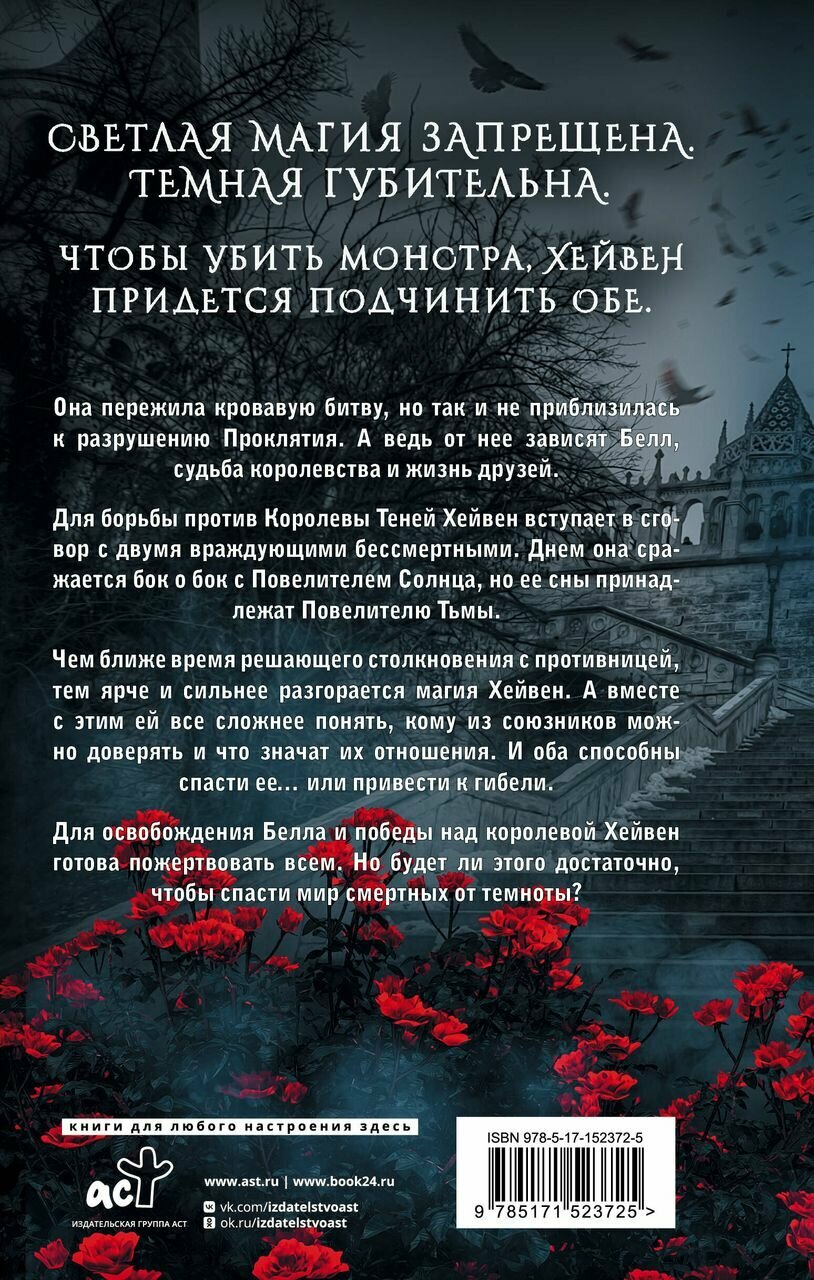 Светлая магия запрещена. Темная губительна. Чтобы убить монстра, Хейвен придется подчинить обе. Она пережила кровавую битву, но так и не приблизилась к разрушению Проклятия. А ведь от нее зависят Белл, судьба королевства и жизнь друзей. Для борьбы против Королевы Теней Хейвен вступает в сговор с двумя враждующими бессмертными. Днем она сражается бок о бок с Повелителем Солнца, но ее сны принадлежат Повелителю Тьмы. Чем ближе время решающего столкновения с противницей, тем ярче и сильнее разгорается магия Хейвен. А вместе с этим ей все сложнее понять, кому из союзников можно доверять и что значат их отношения. И оба способны спасти ее… или привести к гибели. Для освобождения Белла и победы над королевой Хейвен готова пожертвовать всем. Но будет ли этого достаточно, чтобы спасти мир смертных от темноты?