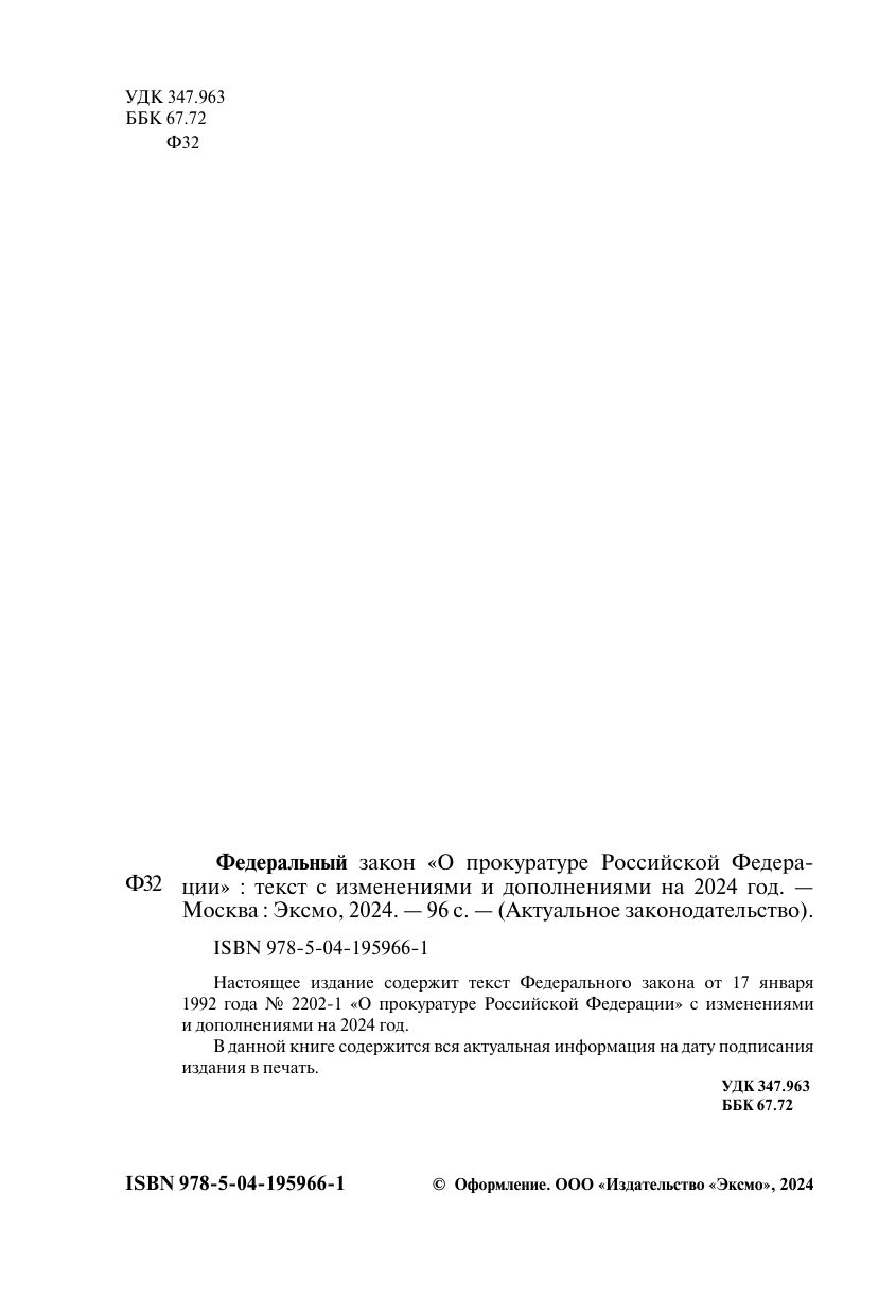 Федеральный Закон "О прокуратуре Российской Федерации": текст с изменениями и дополнениями на 2024 год (без автора); ООО "Издательство "Эксмо", 2024