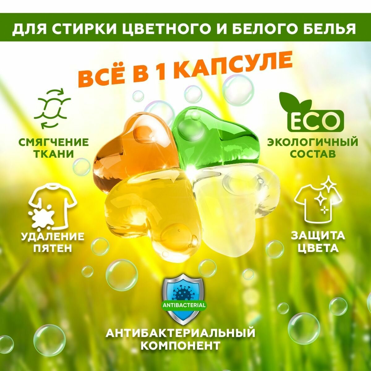 Гель-капсулы для ежедневной стирки от Акинава с кондиционером - это жидкое гель средство для стирки белого и цветного белья нового поколения с антистатическим эффектом. Капсулы для стирки Akinawa растворяются при 20 градусах и помогают сохранить и насытить цвет белья. Все средства для стирки белья Akinawa имеют ЭКОлогически подтвержденный состав и не наносят вреда окружающей среде. Все, что нужно для стирки, в одной капсуле! Благодаря суперконцентрированному составу для регулярной стирки белья общей массой 3 кг достаточно одной капсулы. Мощная, сверхконцентрированная формула, которая эффективно справляется с любыми типами загрязнений и сложными пятнами. Специальный компонент смягчает волокна ткани и защищает их от деформации. Дополнительный кондиционер не нужен. Капсулы выполнены в форме маленьких подушечек. Легкий аромат после стирки легко выражен и надолго сохраняет свежесть вашего белья. Гель для стирки белого и цветного белья бережно отстирывает загрязненное белье, сохраняя яркость цветных вещей. Инновационная оболочка капсул полностью растворится через 2-3 минуты после начала стирки благодаря чему идеально подходят для быстрой экспресс стирки. · Смягчают воду· Гипоаллергенны· Безопасны для белья· Полностью вымываются и не оставляют следов· Можно использовать на даче· Подтвержденный экологичный состав· Супер-концентрированная формула 2 в 1Способ применения: Достаньте капсулу из упаковки и положите ее на дно барабана для того, чтобы вода как можно быстрее её растворила. Поверх капсулы загрузите в барабан стиральной машины до 3 кг. загрязненного сухого белья. При необходимости добавьте ополаскиватель в специальный отсек стиральной машины. Включите стиральную машину и запустите стирку.Назначение: Для стирки цветных изделий из х/б, льняных, синтетических тканей и тканей из смешенных волокон (кроме шелка и шерсти). В случае сильного загрязнения дозировку рекомендуется увеличить до 2х капсул.Меры предосторожности: Не оставляйте капсулы в легкодоступном месте. Избегайте попадания средства в глаза. Храните в защищённом от детей месте. Не допускайте соприкосновения капсул с влагой. Для этого храните капсулы только в герметичной упаковке в сухом месте. Упаковка, в которой продаются капсулы, вполне подойдёт. По истечении срока годности средство и упаковку утилизировать как бытовой отход.