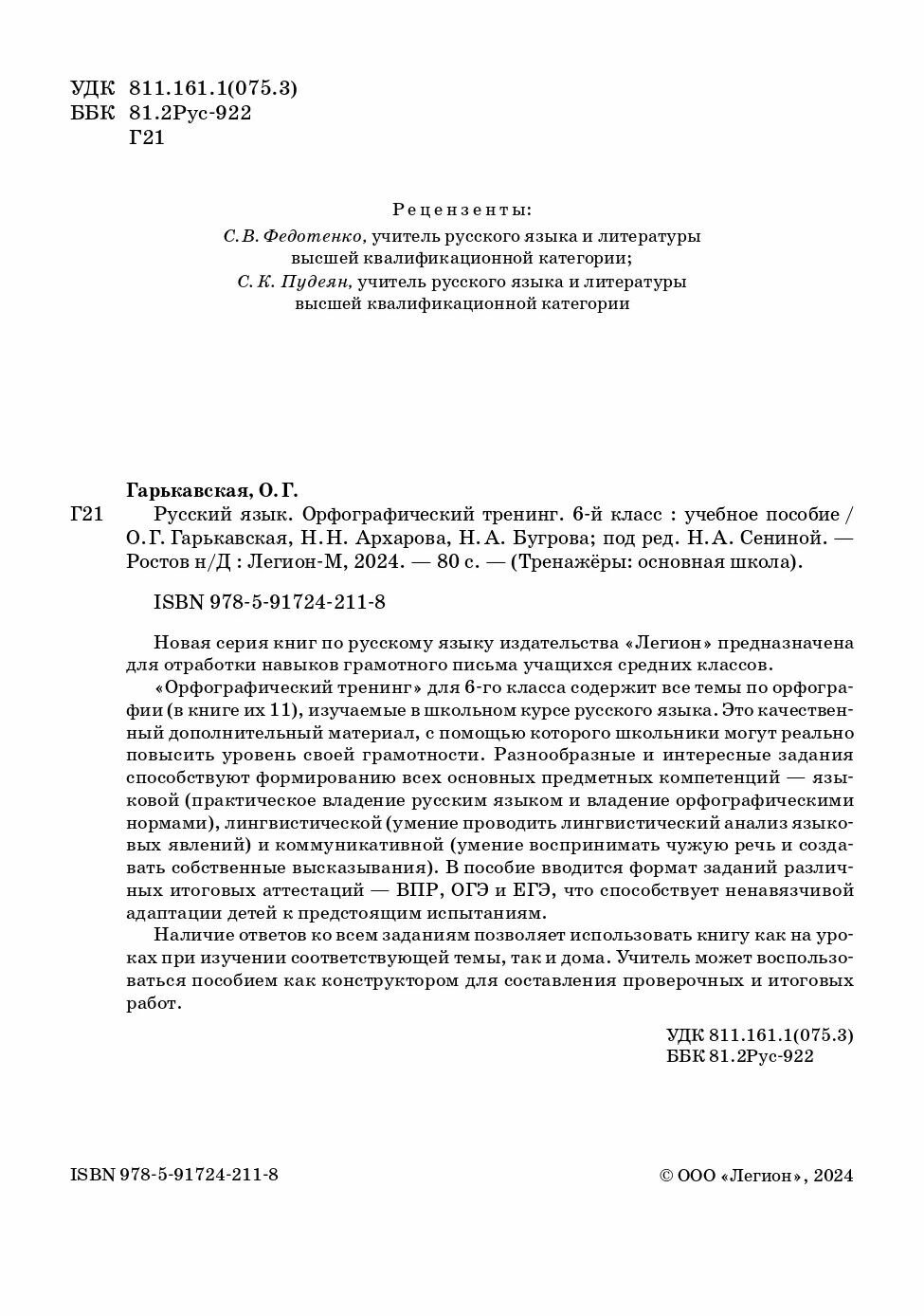 Русский язык. 6 класс. Орфографический тренинг (Бугрова Наталья Александровна, Гарькавская Ольга Геннадьевна, Архарова Наталья Николаевна); Легион, 2024