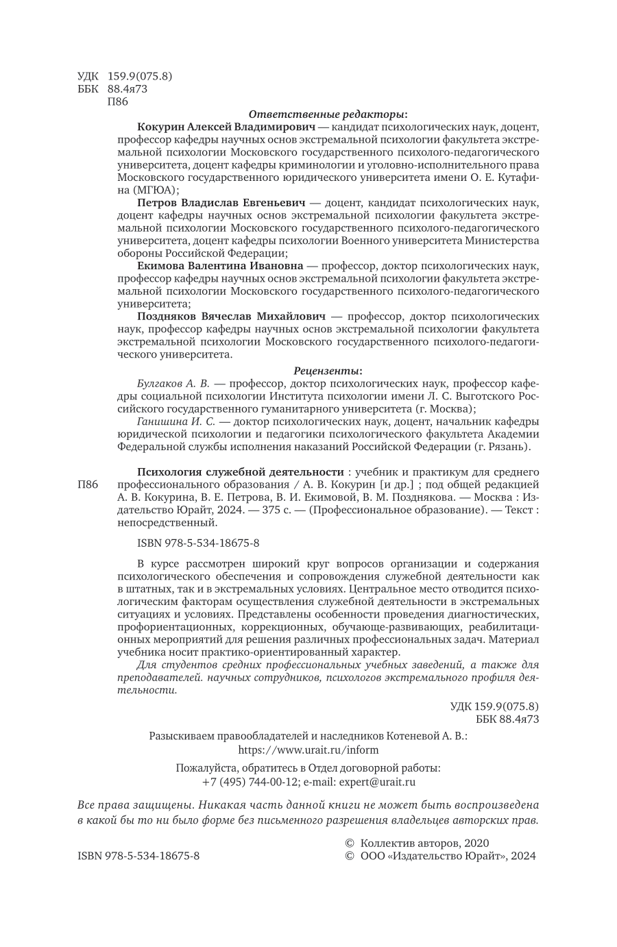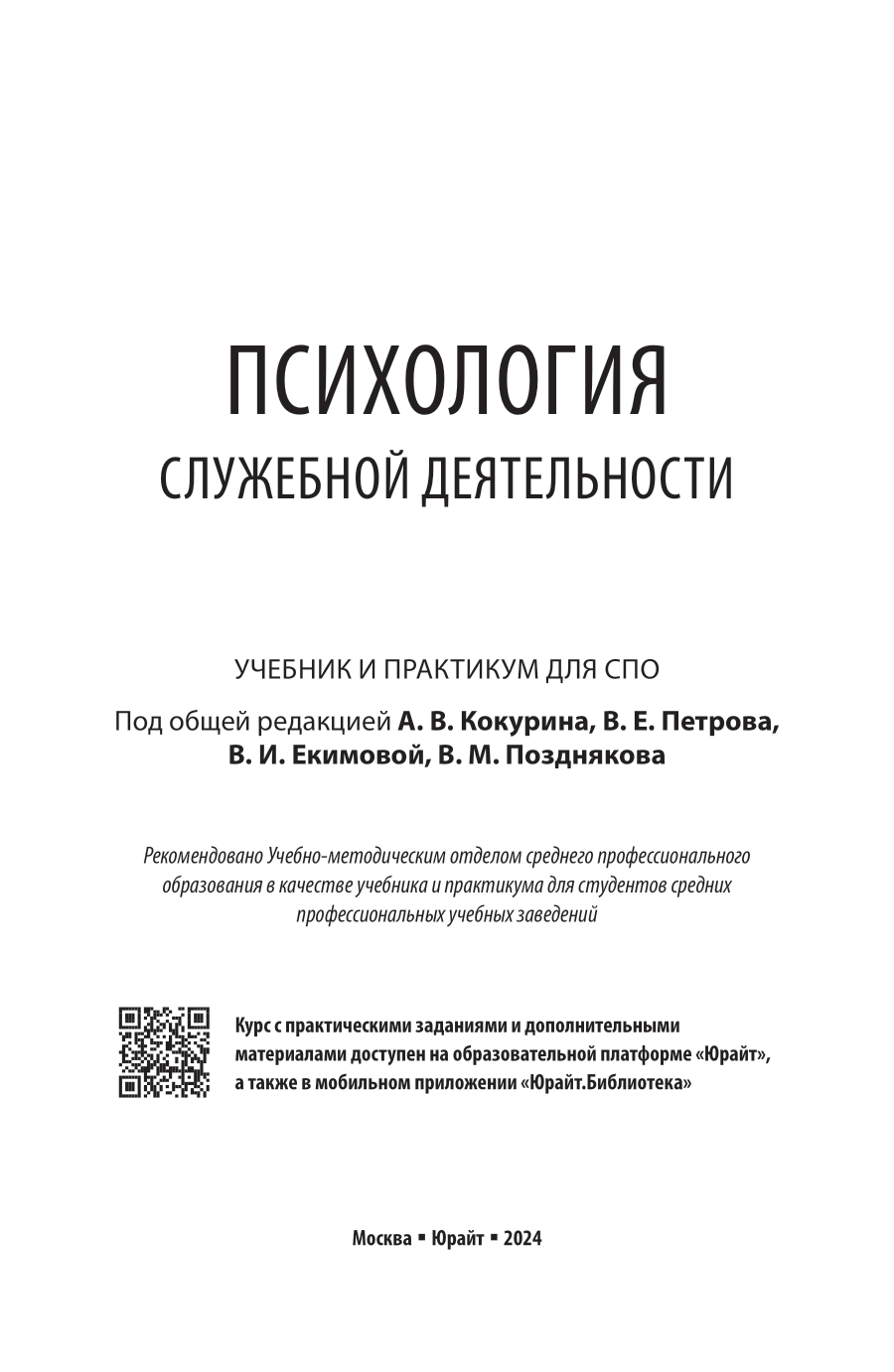 В учебнике рассмотрен широкий круг вопросов организации и содержания психологического обеспечения и сопровождения служебной деятельности как в штатных, так и в экстремальных условиях. Центральное место отводится психологическим факторам осуществления служебной деятельности в экстремальных ситуациях и условиях. Представлены особенности проведения диагностических, профориентационных, коррекционных, обучающе-развивающих, реабилитационных мероприятий для решения различных профессиональных задач. Материал учебника носит практико-ориентированный характер. Для студентов средних профессиональных учебных заведений, а также для преподавателей. научных сотрудников, психологов экстремального профиля деятельности.